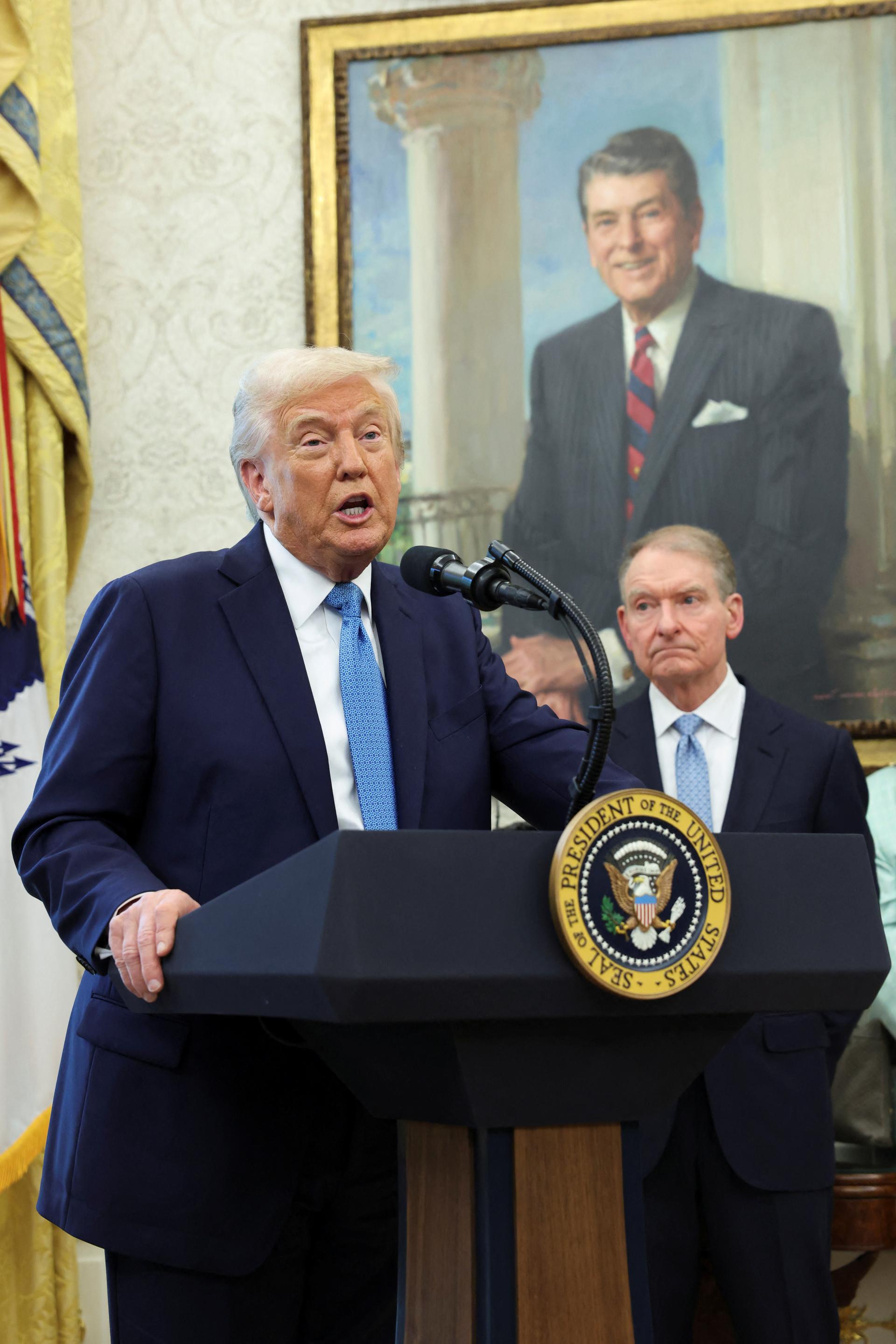 Donald Trump speaks during a swearing-in ceremony for the Chairman of the SEC Paul Atkins in Washington, D.C., April 22, 2025. REUTERS/Kevin Lamarque/File Photo |