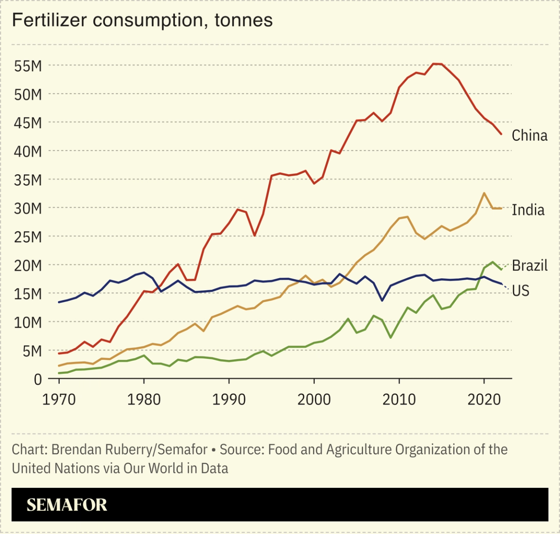 China’s use of agricultural fertilizers peaked more than a decade ago, thanks to the rise of precision agriculture and a change in government subsidies. Our World in Data noted that while China’s population has doubled since the 1960s, its food production per capita has increased in that time. Fertilizers played a key role, but subsidies led to their overuse, with considerable environmental impacts. In 2015, the government reduced those subsidies, and instead incentivized precision agriculture, machinery, and education, making farms much more efficient. Europe saw a similar curve — its fertilizer use per hectare has halved since 1990. Global use may have peaked in 2020, even as available calories per capita worldwide continue to increase.