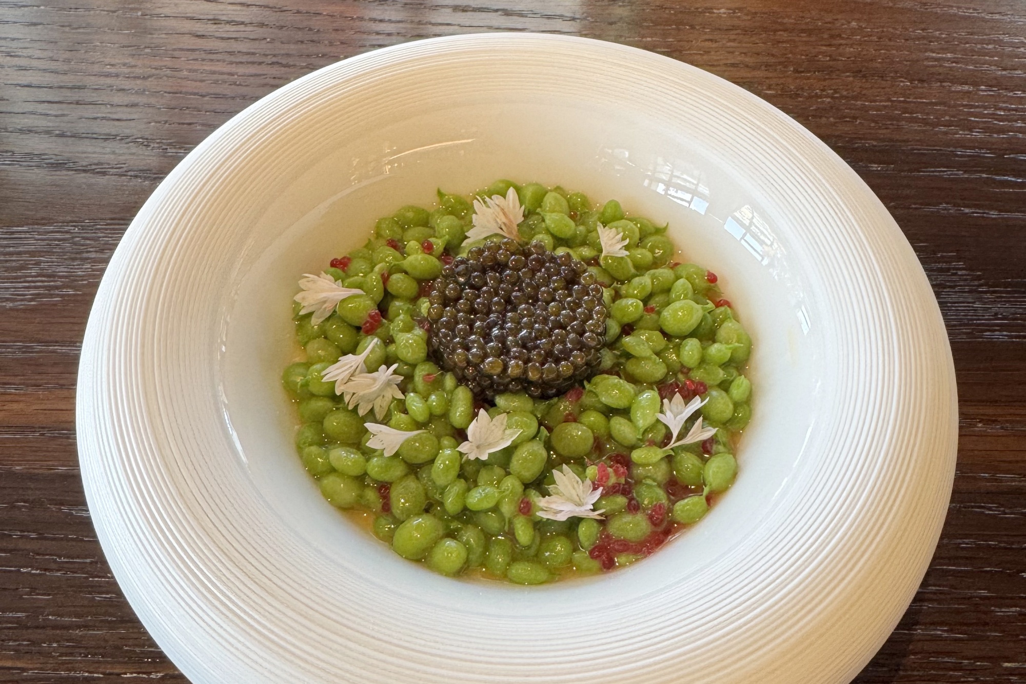 Vegetal chawanmushi and caviar with teardrop peas and ebi shrimp. Photographer: Alan Wong/Bloomberg