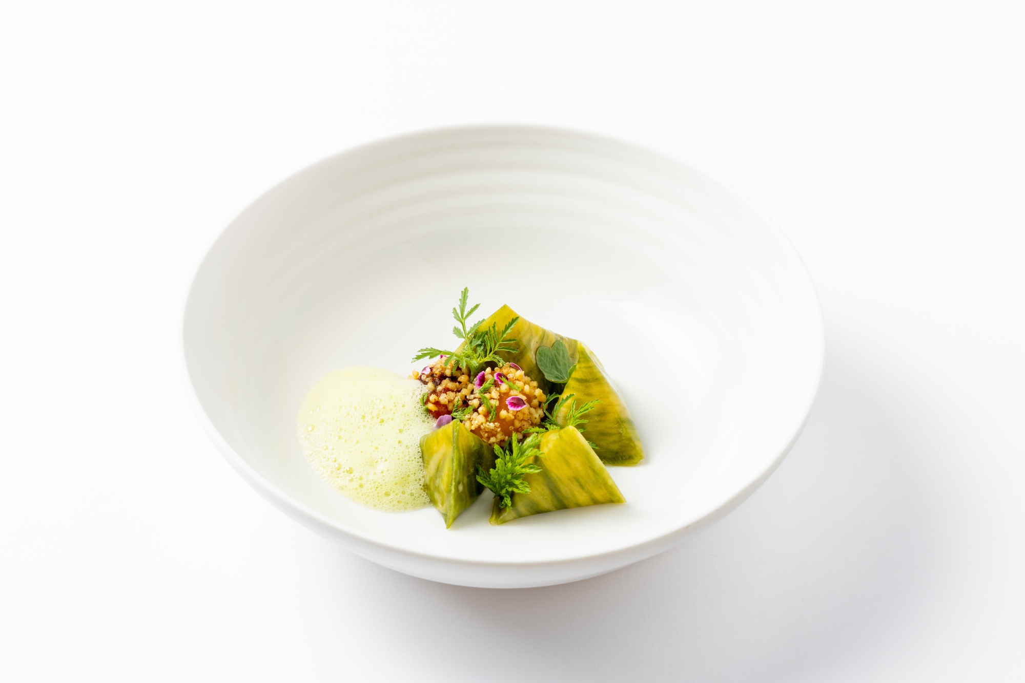 Pasta parcels filled with goat cheese, green tomato consomme, chrysanthemum and marigold. Source: Cristal Room by Anne-Sophie Pic