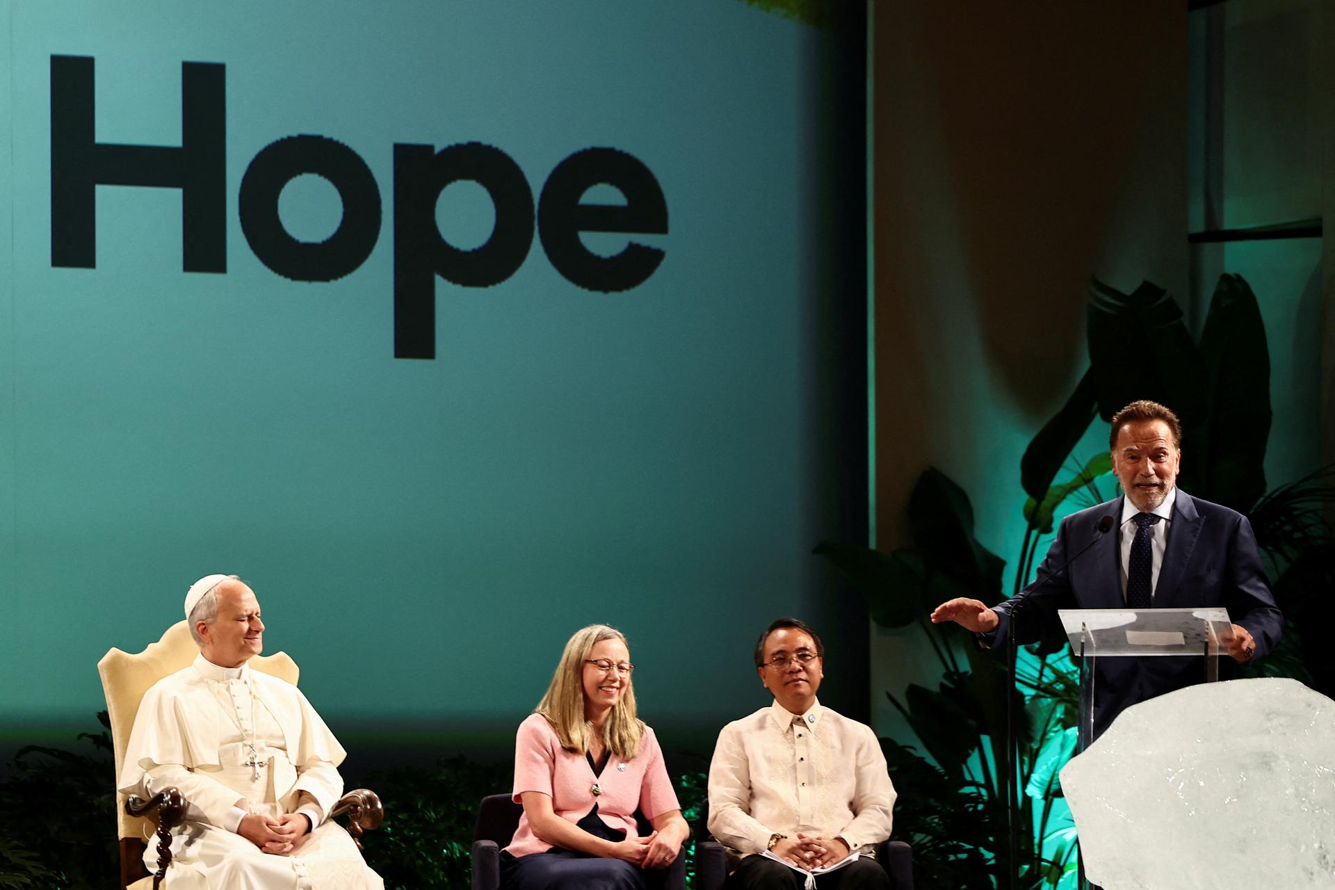 Pope Leo smiles as Arnold Schwarzenegger speaks during a conference on "Raising Hope for Climate Justice" in Castel Gandolfo, near Rome, Italy. REUTERS/Yara Nardi |