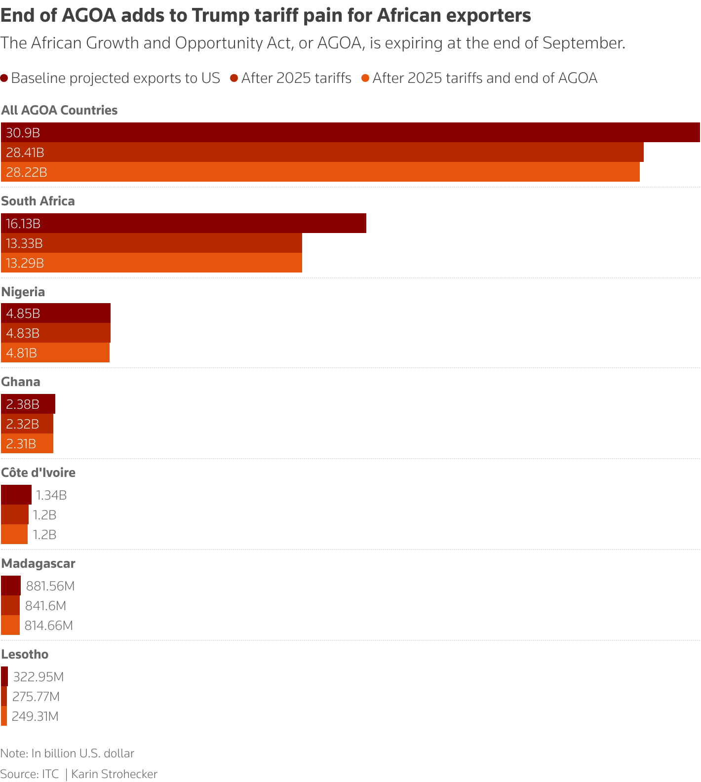 AGOA: U.S. President Donald Trump's administration is supporting a one-year extension of the African Growth and Opportunity Act, known as AGOA, a law first passed in 2000 to provide duty-free access to the U.S. market for thousands of products. Its impact has been diluted by the tariffs Trump introduced in August, which exposed products once exported duty-free under AGOA to U.S. import taxes of between 10% and 30%.