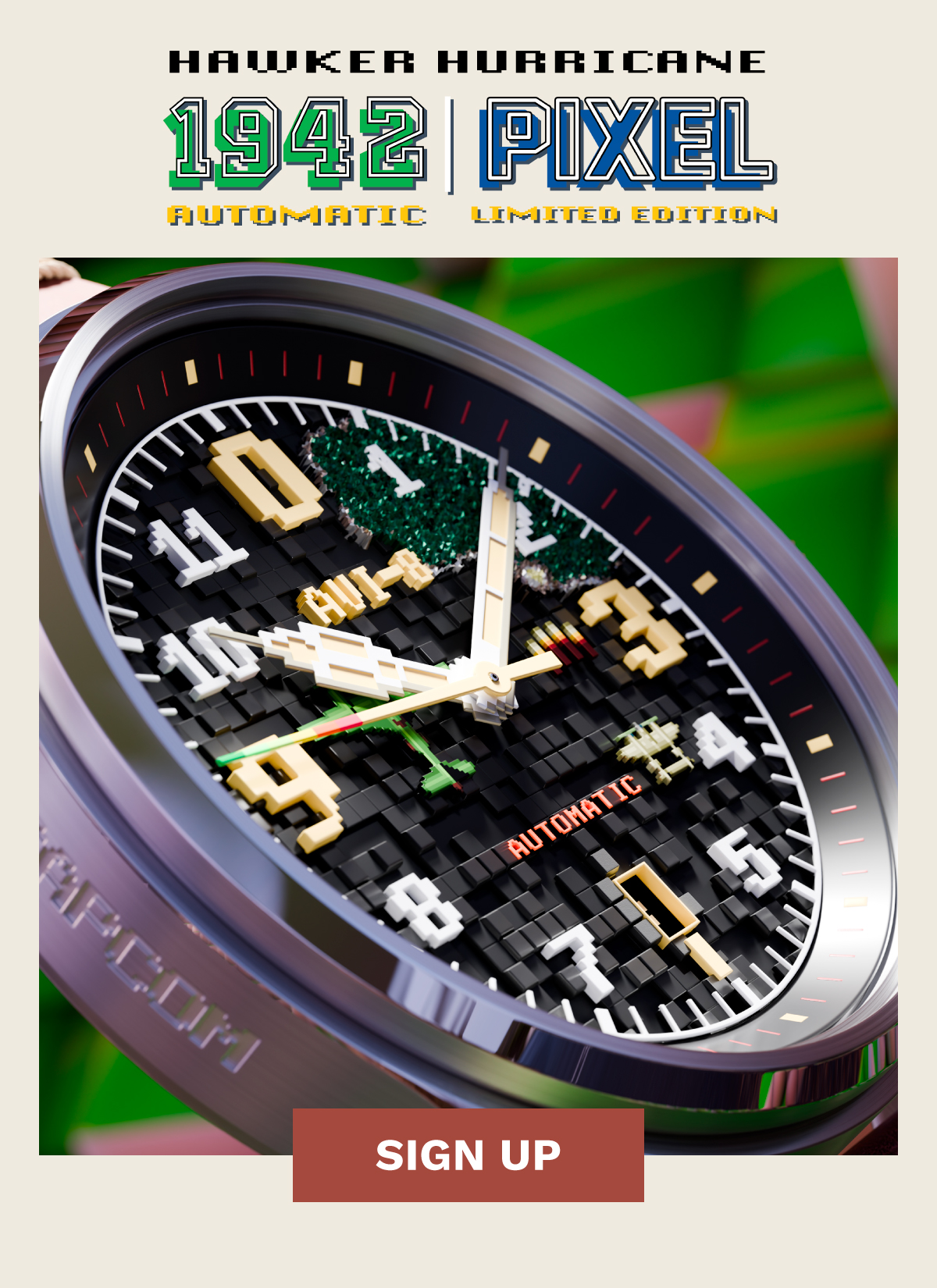 The Hawker Hurricane Clowes Automatic Capcom 1942 Pixel Limited Edition brings aviation heritage and arcade nostalgia together in a striking 3D pixel dial, glowing with Swiss lume.
