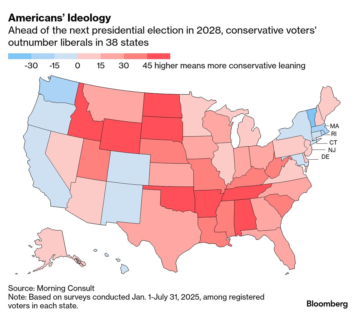 Conservatives outnumber liberals in 38 states, with the highest share of residents who identify as conservative in Wyoming, Alabama, the Dakotas and Idaho. In no state do the majority of voters identify as liberal. The largest liberal shares are in Vermont, Washington and Oregon. The data comes from new daily polling from Morning Consult of the ideological alignment of voters in all 50 states, and may provide key insights into which states will be competitive in the 2028 presidential election. Among those considered swing states, Georgia and North Carolina are furthest to the right and Nevada closest to the middle. Conservatives also have double-digit advantages in the key states of Pennsylvania, Michigan and Wisconsin. — Alex Tanzi