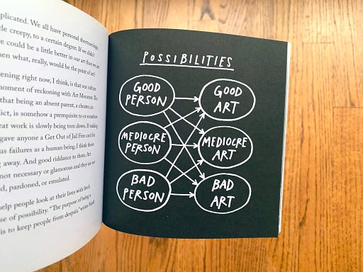 “One of the beautiful things about art is the way that our practice can allow us to lift out of our normal, habitual selves and into someone better/more interesting.” George Saunders being sane about “problematic” art. See also my chart from Keep Going: