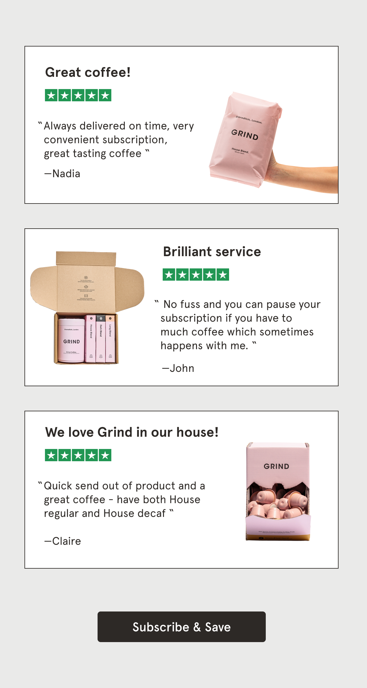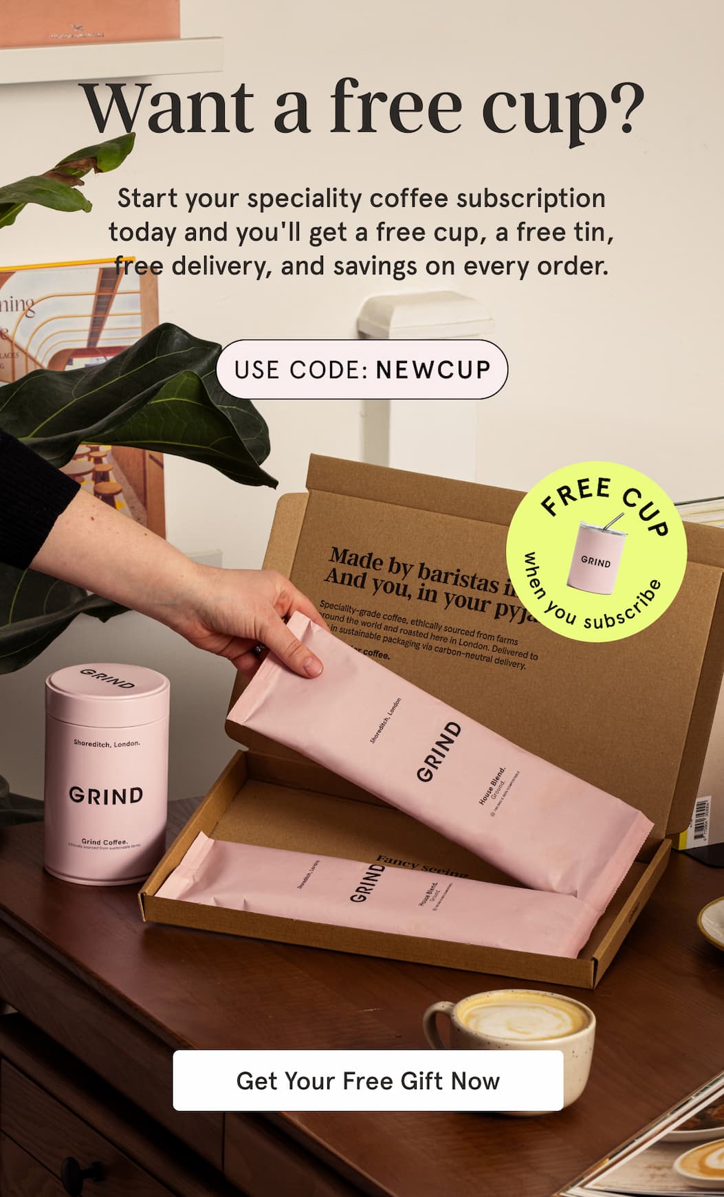 Our free cup offer applies to new subscription orders only, while stock lasts. A free Grind cup will be added to your basket when you purchase a subscription and use the discount code NEWCUP. This offer excludes existing subscription orders, gift subscriptions, gift cards, and one-time purchases, and cannot be combined with any other offer or discount. Offer applies to UK subscription orders only.
