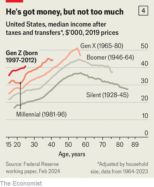 Now, for what it’s worth, I disagree pretty strongly about the claim that “you can reduce 80 percent of culture wars to questions of economics”. There’s pretty strong evidence that many sociocultural issues — and many of the divisions in American society over the last decade — revolve around either conflicts of values or perceived conflicts between identity groups. The economics of immigration, for example, change little over time, but sometimes many Americans see immigrants as a threat, while at other times they take a welcoming attitude. Across countries, too, attitudes toward immigration differ radically; it’s hard to imagine that these differences are all dollars and cents. Race relations abruptly crashed around 2013-14, even though the economy was doing OK by then. There’s also evidence that media technologies can exert strong effects on public opinion; for the same economy, you could get very different politics depending on whether people are getting their news from CBS and ABC or from X and Reddit. You can always choose to believe that subtle, unobserved economic changes are behind every cultural shift and identity conflict, but it’s not a very parsimonious or useful explanation. But that having been said, I do think Thiel might have a purpose when he says that culture wars are fundamentally economic, even if it isn’t strictly true. Cultural issues are hard to solve — differences in values are deep-rooted and often immune to persuasion, while identity conflicts can take on a life of their own. We just don’t have great toolkits for solving those sorts of problems. But we do have a lot more of an idea of how to give people more of what they want in the material sense. So you can argue that economics should be our primary focus, simply because we have greater agency in terms of fixing it. “God grant me the courage to change the things I can”, and so on.¹ And Thiel is exactly right that if you’re going to address economic problems, real estate is probably the one you want to start with, especially if you’re trying to make things better for young people. In many ways, the economy is working just fine for America’s young generations. For example, Zoomers and Millennial men have higher wages than previous generations did at similar ages, with Gen Z looking especially good: