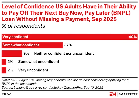 Key stat: The majority (87%) of US adults are at least somewhat confident in their ability to pay off their next buy now, pay later (BNPL) loan without missing a payment, found September data from LendingTree and QuestionPro. | | | |