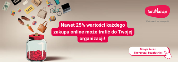 Najwyższa darowizna od jednego Wspierającego w październiku? 842,62 zł! Powiedz TAK dodatkowym środkom dla Twojej organizacji! Ponad 1800 sklepów dzieli się zyskiem - dzięki temu na konto organizacji może trafić średnio 2,5% (nawet do 25%!) wartości zakupów. A to wszystko bezpłatnie! Dołącz do FaniMani.pl i dowiedz się więcej >