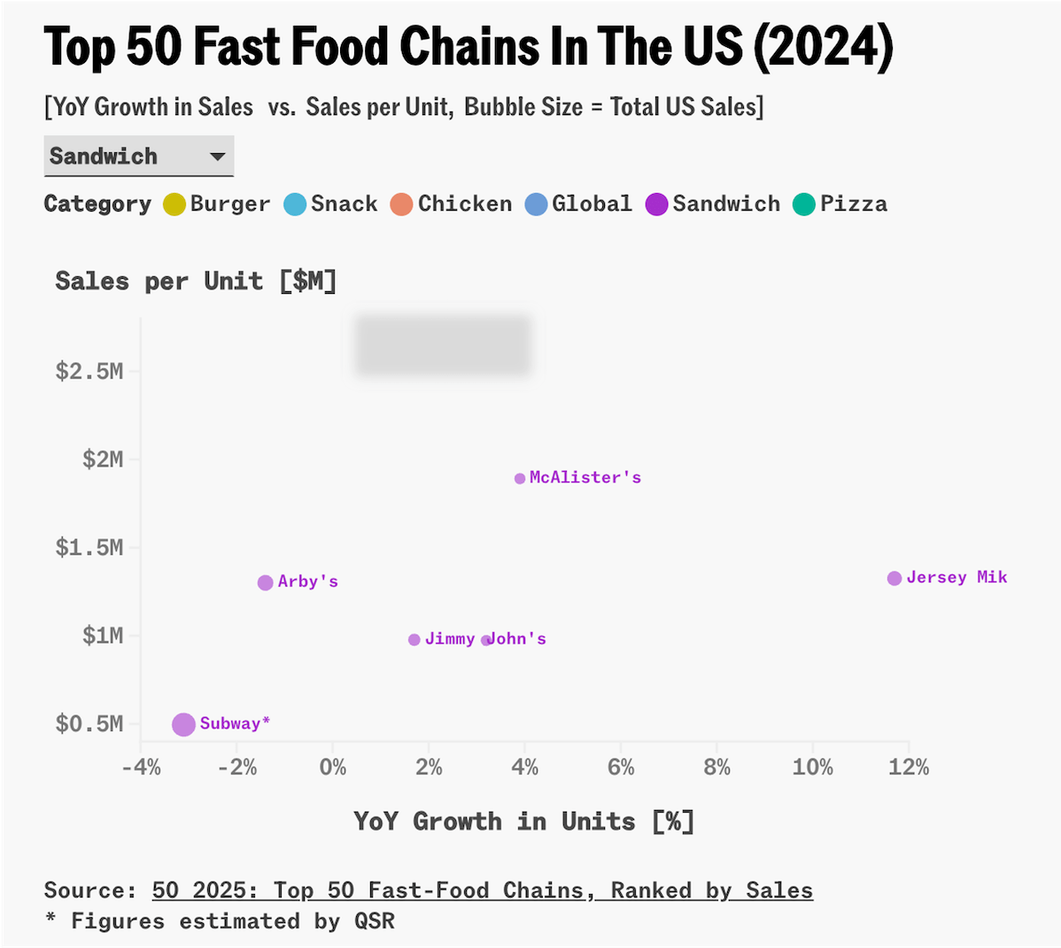 Off the charts: Which sandwich chain last week announced that it would be revamping its menu (starting with lettuce) as revenues have slipped since peaking in 2023? [Answer below].