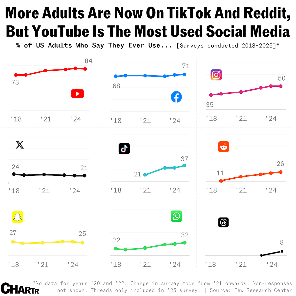 Still, a growing awareness of the risks doesn’t seem to be deterring too many Americans just yet. Last week, Pew Research Center published an update to their survey on social media use, finding that roughly half of Americans in 2025 use Facebook and YouTube every single day (52% and 48%, respectively).