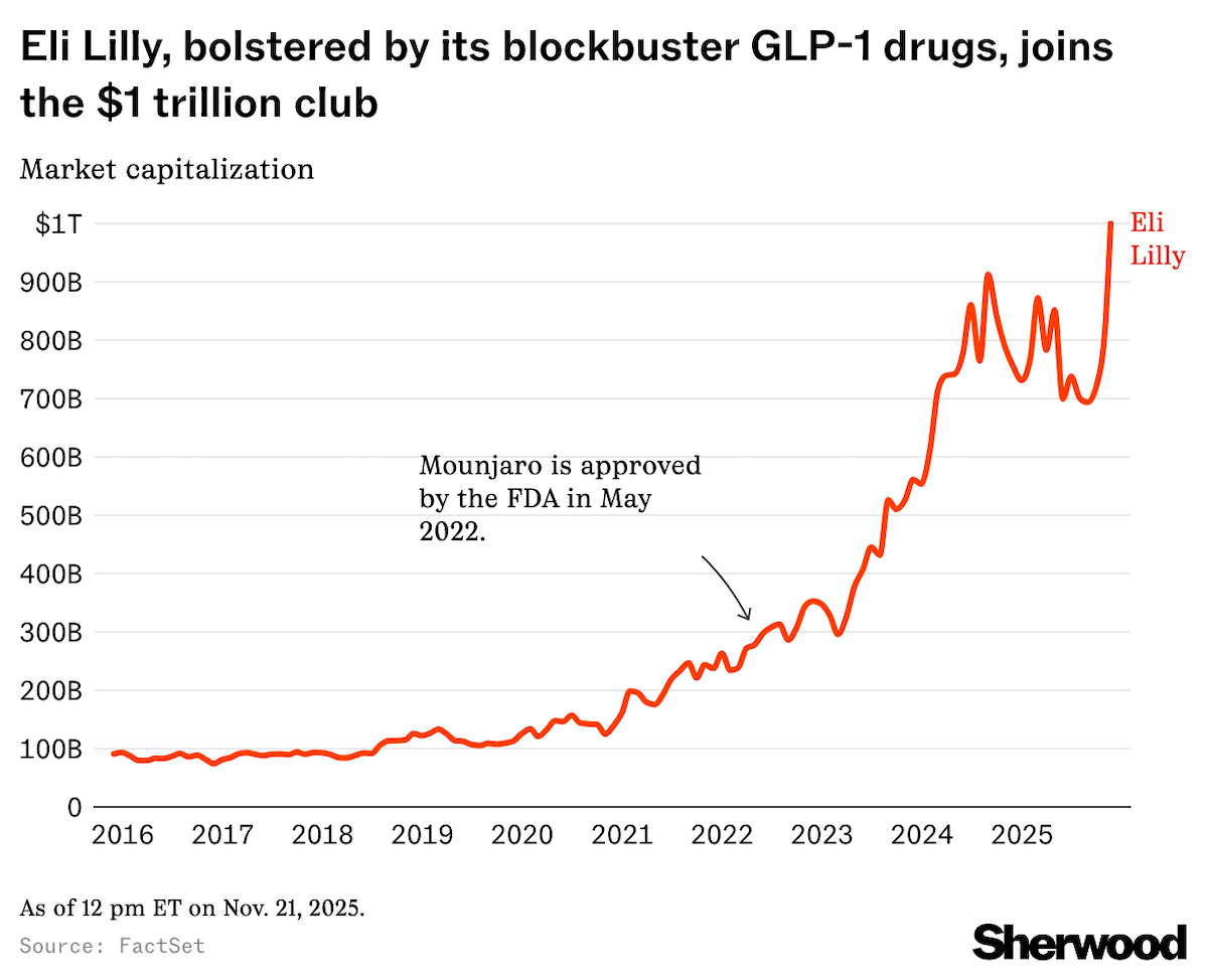 Big Pharma has never been bigger, at least financially: Eli Lilly, buoyed by sales of its blockbuster weight-loss drugs Mounjaro and Zepbound, joined the $1 trillion market cap club towards the end of last week.