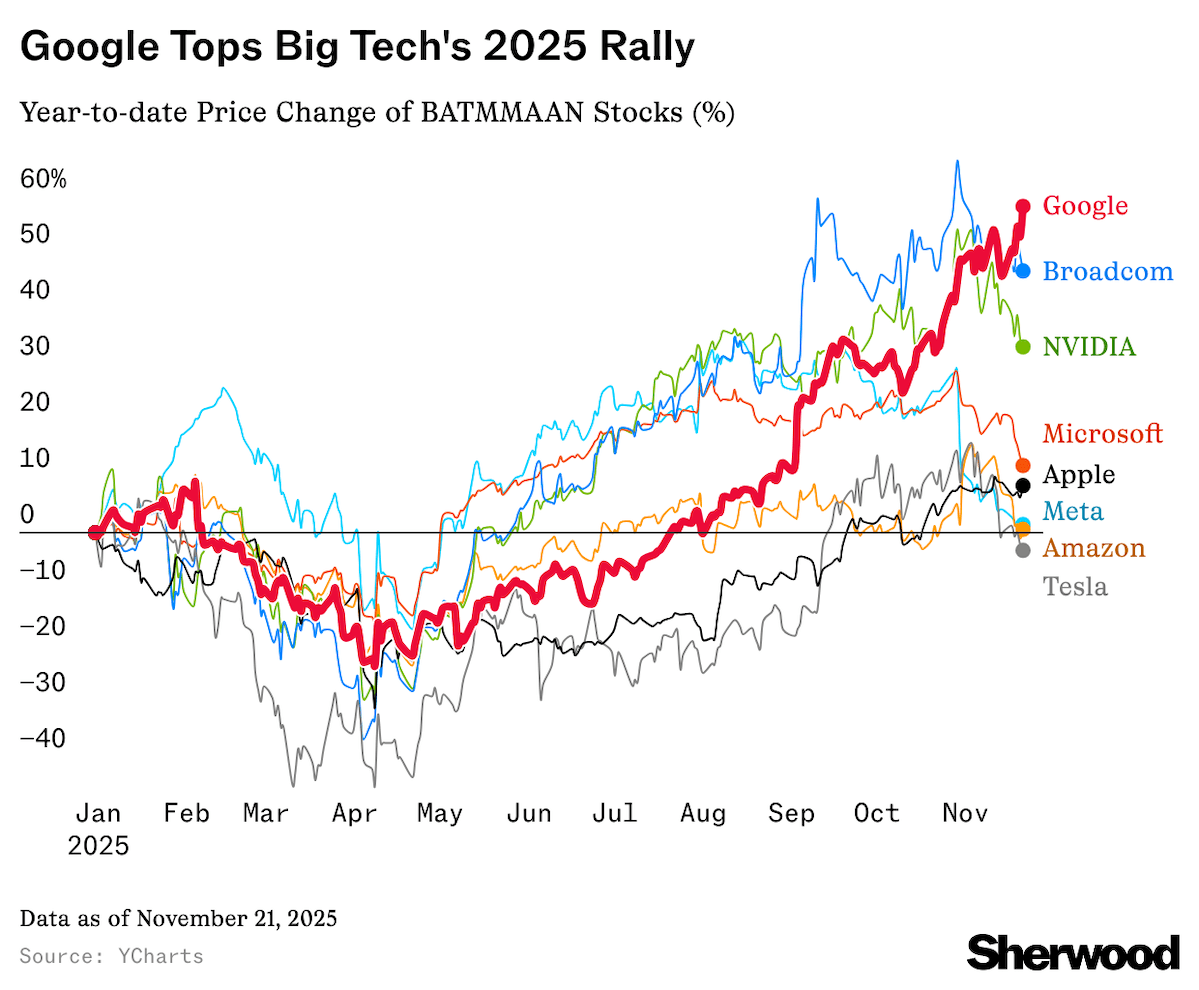 That release, combined with the landmark news in September that the nuclear antitrust option — breaking the company up — was essentially off the table, has been the catalyst for a stellar run in Alphabet shares, which is now the best-performing BATMMAAN stock in 2025.