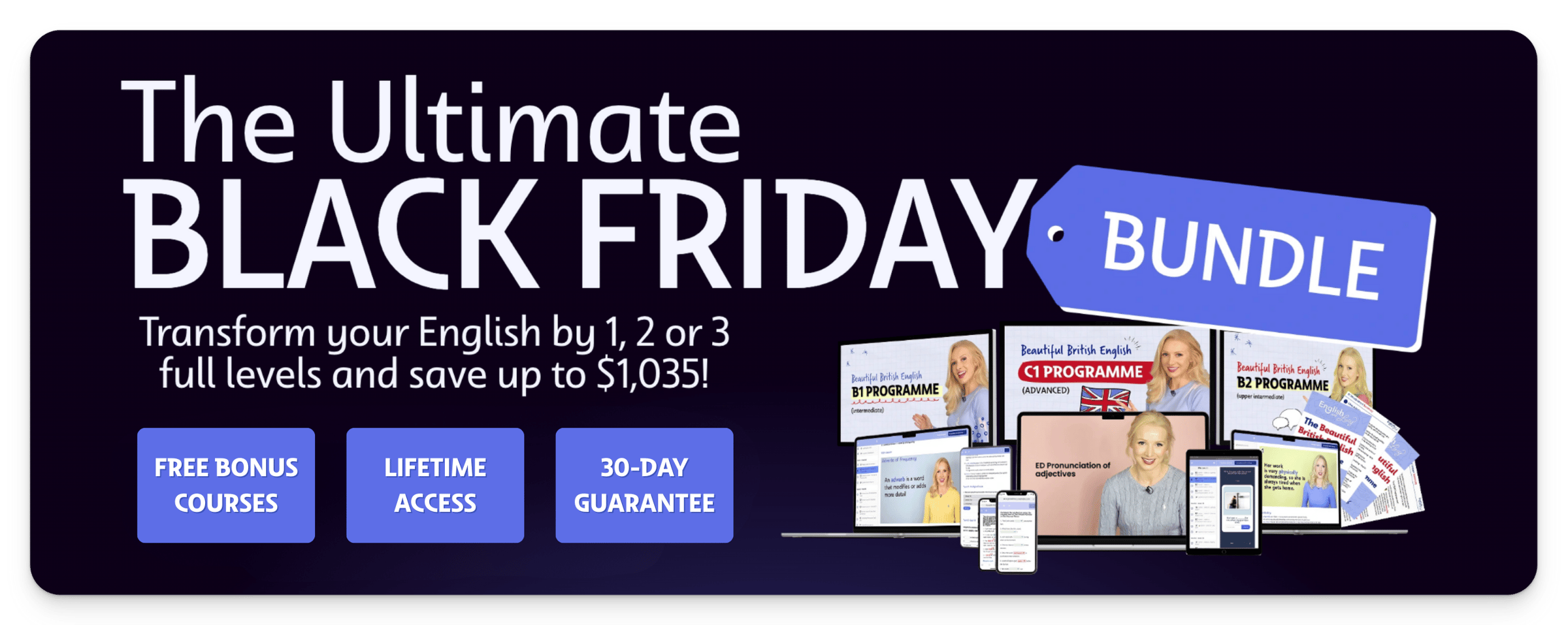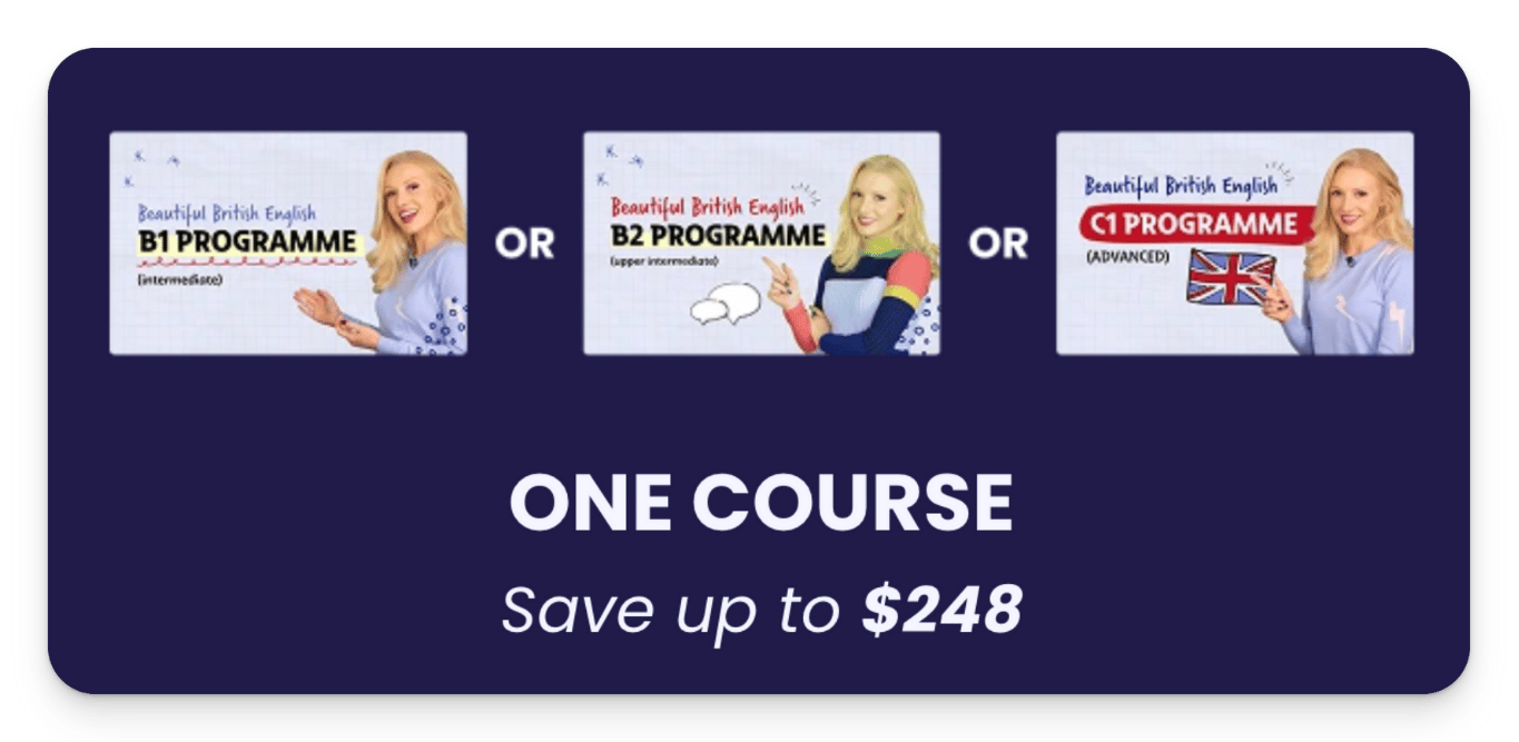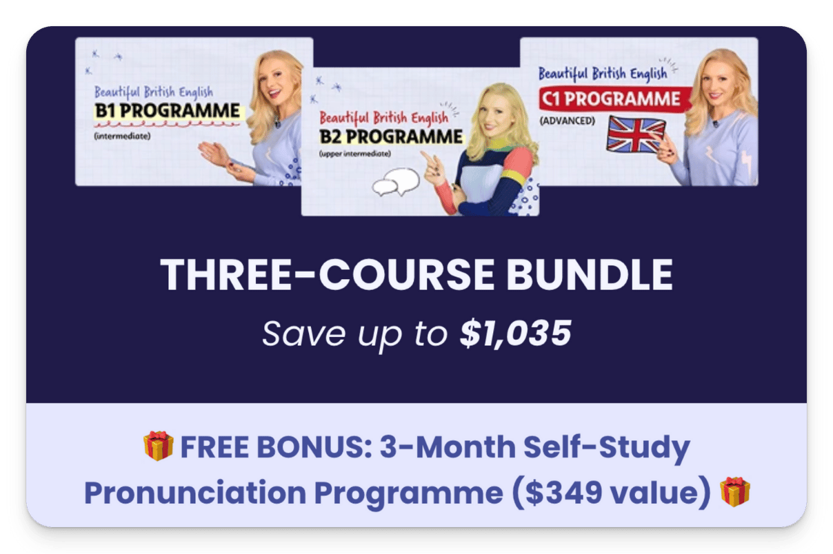 Join the COMPLETE bundle and unlock the full transformation with lifetime access to the B1, B2 and C1 Programmes. Get 50% off plus my 3-Month Pronunciation Programme FREE (worth $349)