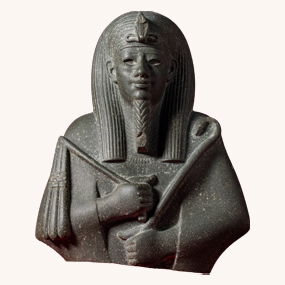 Ca. 380 - 342 BC. An exceptional green schist bust of a god Osiris; his hands emerging from his cloak and holding the crook and flail.