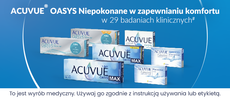 #www.clinicaltrials.gov to strona internetowa prowadzona przez NIH. 29 badań klinicznych oceniających subiektywny komfort noszenia jako pierwszo lub drugorzędowy wynik badania dla soczewek dwutygodniowych marki ACUVUE® OASYS, soczewek ACUVUE® OASYS 1-Day with HydraLuxe Technology i soczewek ACUVUE® OASYS MAX 1-Day, w porównaniu z produktami konkurencji. Przegląd według stanu na dzień 30 kwietnia 2025. ^Wszystkie soczewki marki ACUVUE® posiadają filtr UV, który pomaga zapewnić ochronę przed przenikaniem szkodliwego promieniowania ultrafioletowego do rogówki i położonych głębiej struktur oka. Soczewki kontaktowe wyposażone w filtr UV NIE MOGĄ zastąpić pełnej ochrony oczu takiej jak okulary przeciwsłoneczne zatrzymujące promieniowanie ultrafioletowe, ponieważ soczewka nie osłania całej powierzchni oka ani sąsiednich obszarów. Należy nadal stosować okulary przeciwsłoneczne pochłaniające promieniowanie UV, zgodnie z zaleceniami specjalisty. *Źródło: Euromonitor International Limited; Eyewear 2025; wartość sprzedaży w kanałach detalicznych, dane z 2023; "Rodzina marek ACUVUE®" generuje łączną wartość sprzedaży następujących marek: 1-Day ACUVUE®, ACUVUE® OASYS, ACUVUE® VITA® i ACUVUE®2. 1.Dane firmy JJV 2024. INNOWACJE marki ACUVUE® EYE-INSPIRED™. Soczewki kontaktowe ACUVUE® mogą być stosowane do korekcji wzroku. Aby uzyskać szczegółowe informacje na temat prawidłowego używania, pielęgnacji i bezpieczeństwa, należy się skontaktować ze specjalistą ochrony zdrowia oczu i zapoznać z instrukcją używania dostępną na stronie www.e-ifu.com. Więcej informacji dostępnych jest pod adresem www.acuvue.com/pl-pl/information/. Producent: Johnson & Johnson Vision Care, Inc. (USA). Upoważniony przedstawiciel: AMO Ireland (Irlandia). Znaki towarowe prezentowanych produktów z portfolio ACUVUE® należą do Johnson & Johnson. Reklama prowadzona przez Johnson & Johnson Poland Sp. z o. o. z siedzibą w Warszawie. Polska 2025. 2025PP11502