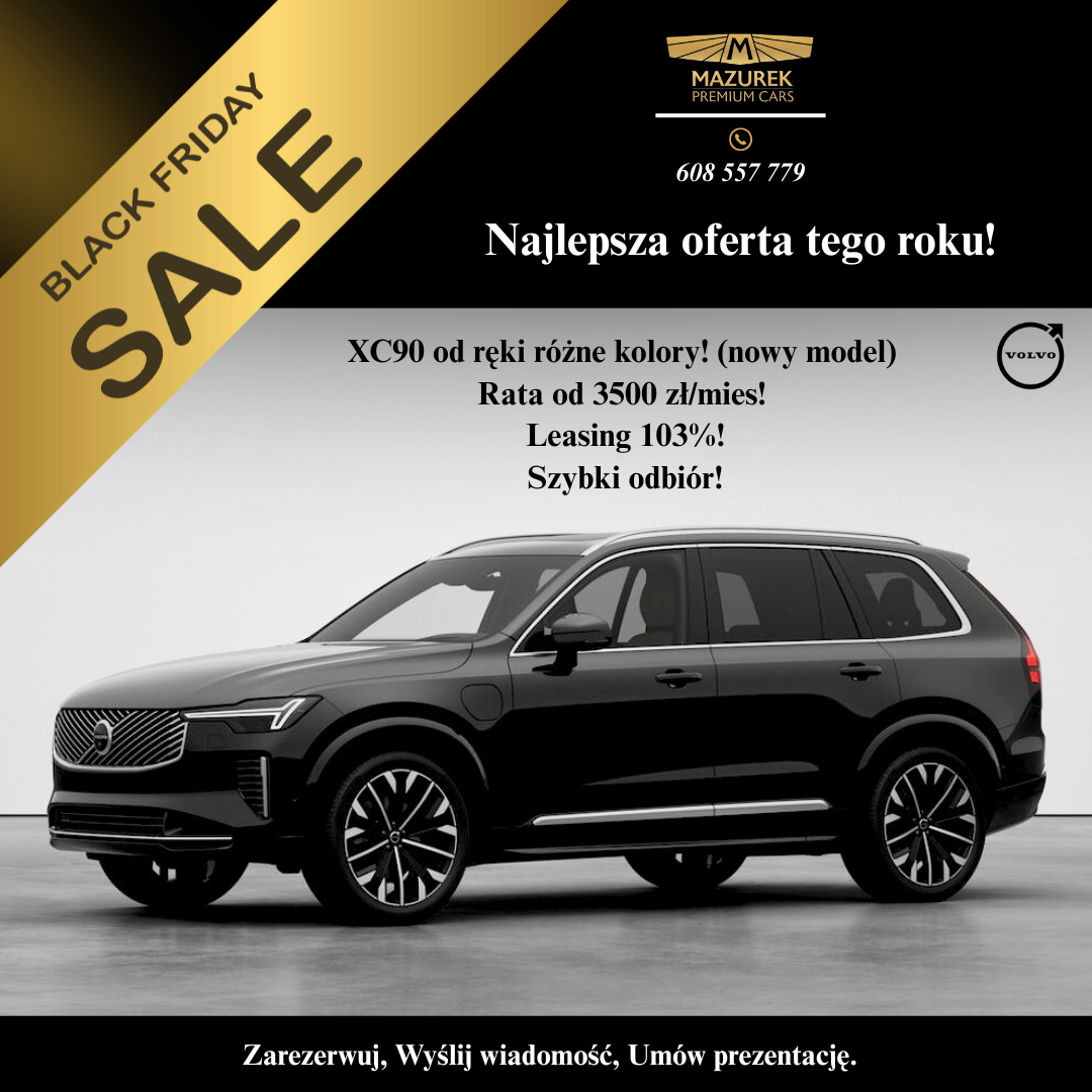XC90 w najnowszym modelu, dostępne od ręki w kilku eleganckich kolorach, z ratą już od 3 500 zł/mies. i leasingiem od 103% – to jedna z naszych najlepszych propozycji w tym roku.