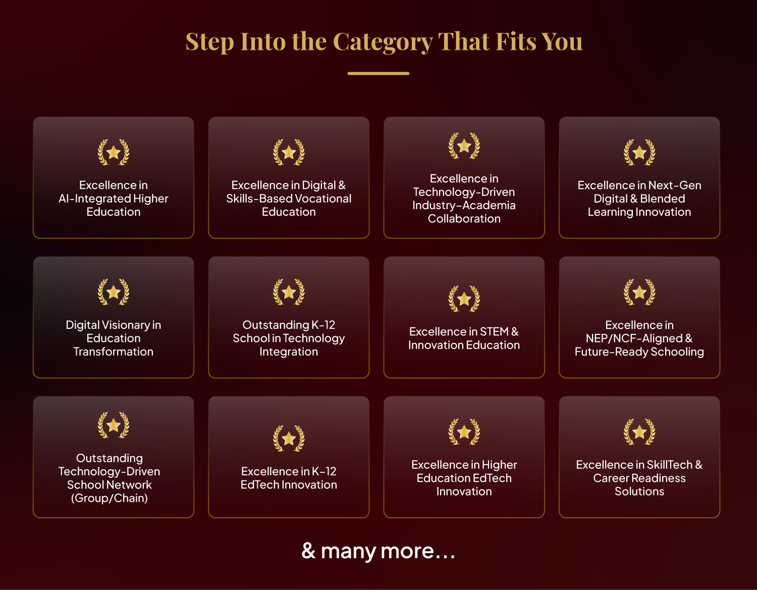 Whether your strengths lie in AI-powered learning, digital ecosystems, smart classrooms, skill development, XR, blockchain credentials, inclusion, or career readiness, each innovation can be recognised separately.