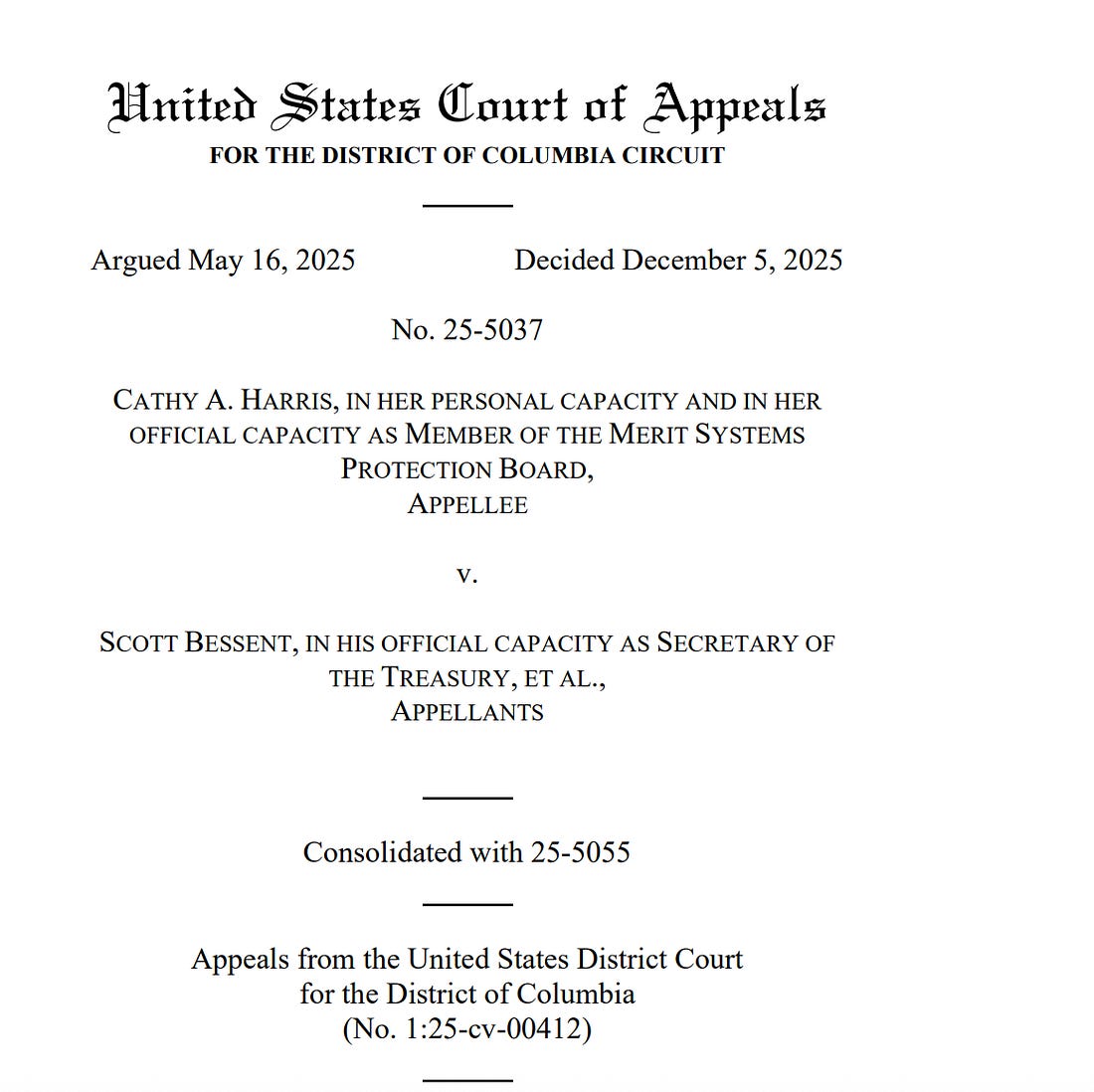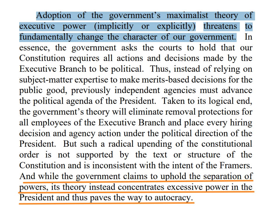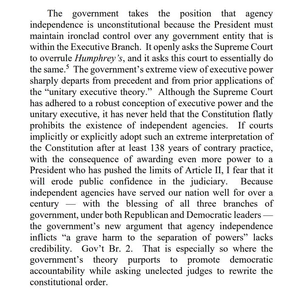A 2-1 Panel of the D.C. Circuit Makes the Presidency More MuscularAn important case, as the Supreme Court takes up a similar issue next weekThis morning, a panel of the D.C. Circuit that split 2-1 ruled that presidents can remove members of the National Labor Relations Board (NLRB) or Merit Systems Protection Board (MSPB) despite the existence of laws that are intended to shield them from removal without cause. That’s precisely what Donald Trump did. This opinion, with Judges Neomi Rao and Gregory Katsas, both Trump appointees, in the majority, blesses it. This case is too important to get lost in the crush of other news, so I’m writing a rare midday post about it, to make sure we focus on this decision. The case is styled as Harris v.o Bessent, although there are numerous parties involved and the order directly impacts the president’s ability to fire at will. The only good thing to say about this opinion is that it starts off with a clear statement about the court’s decision: “These appeals present the question whether Congress may constitutionally prohibit the President from removing members of the National Labor Relations Board and Merit Systems Protection Board without cause. The district courts upheld the constitutionality of statutory removal protections for members of these boards. We reverse.” Next comes the deeply unsatisfying explanation: “Under Humphrey’s Executor v. United States … Congress may restrict the President’s ability to remove principal officers who wield only quasi legislative or quasi-judicial powers. But under Seila Law LLC v. Consumer Financial Protection Bureau…Congress may not restrict the President’s ability to remove principal officers who wield substantial executive power.” Humphrey’s Executor is a case we’ve heard a lot about recently because the Supreme Court is considering a case that may lead to reversal or constriction of the longstanding precedent that protected certain appointees from this sort of dismissal. We discussed that case and its significance here if you want a refresher. The pending case is Trump v. Slaughter, which the Supreme Court will hear argument in on Monday. We’ll discuss it in Sunday’s “The Week Ahead” post. Suffice it to say, this opinion may be a preview of how the Court decides Slaughter, which makes it well worth our attention. So how does the majority on this 2-1 panel justify giving Donald Trump the power to remove at will people he disagrees with or thinks are insufficiently loyal to him personally? The do it like this: “As explained below, the NLRB and MSPB wield substantial powers that are both executive in nature and different from the powers that Humphrey’s Executor deemed to be merely quasi-legislative or quasi-judicial. So, Congress cannot restrict the President’s ability to remove NLRB or MSPB members.” Judge Florence Pan starts her dissent by explaining why it’s important for some parts of government to retain independence from the White House: “The public is well served when some parts of our government are insulated from the fray of politics. That is because certain government functions are, or should be, nonpartisan.” She offers examples that put some flesh on the bare bones:
