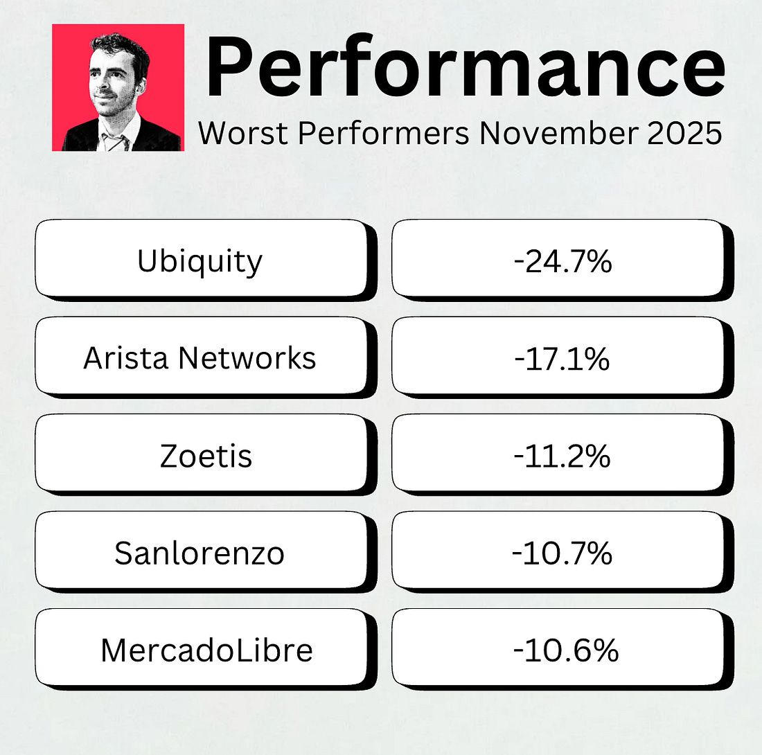 By monthly tradition, you’ll get an update on our Best Buys of the month. What’s going on in the markets? And what are our favorite stocks? Let’s get a little bit wiser today. November 2025The S&P 500 was flat in November. Investors are Fearful today according to the Fear & Greed Index: Best & Worst PerformersThis overview shows you the best and worst performers in our investable universe. Worst performersThe cheaper we can buy great companies, the better. Here are the worst performers of the past month: MercadoLibre is an interesting business. The CEO Marcos Galperin recently said the following on X (Twitter):