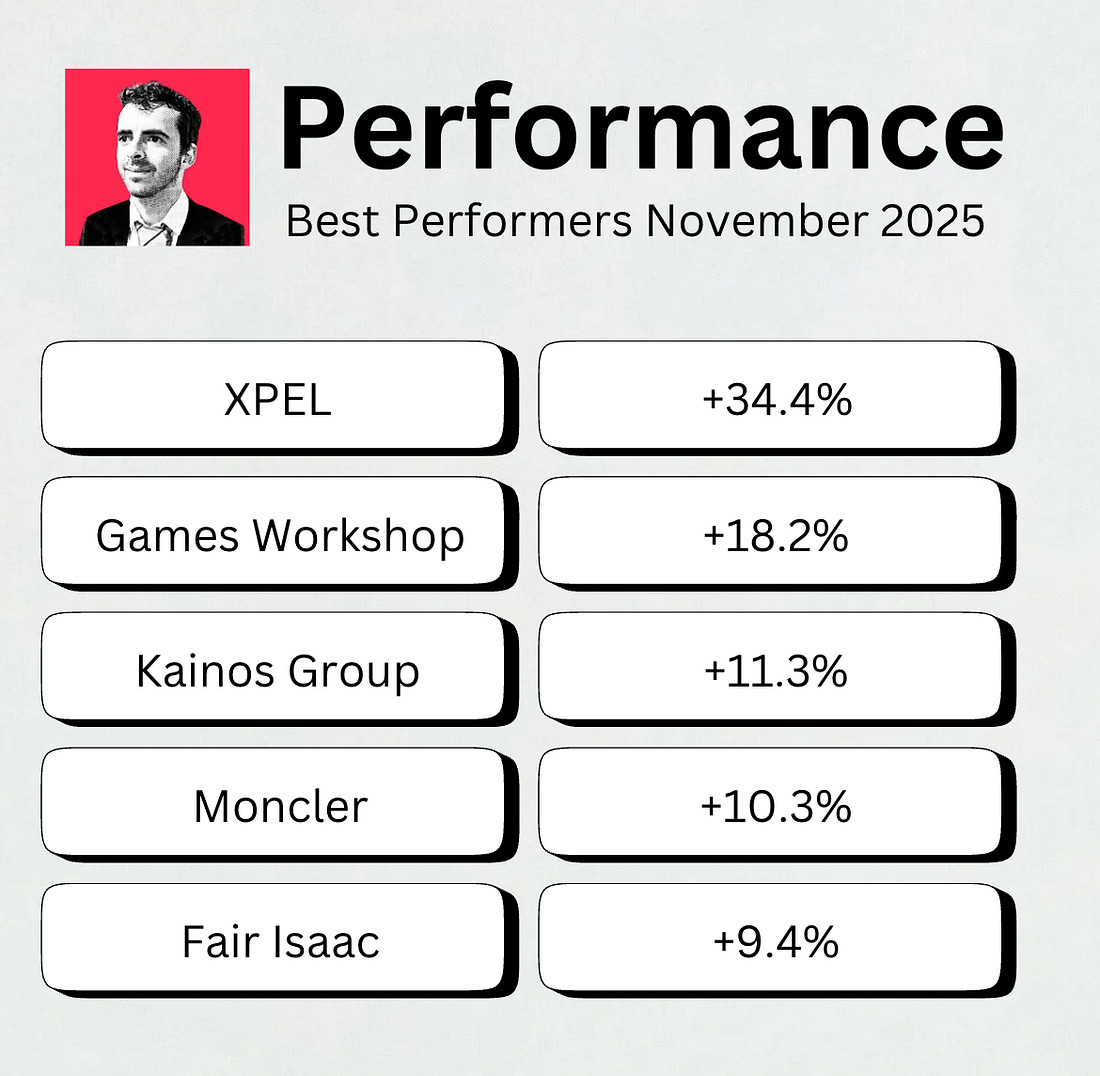 Best performersHere are the best performers of November: Games Workshop published great results. The stock trades at an all-time high now: |