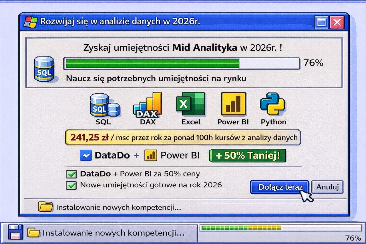 ✔ chcesz mieć w końcu konkretny system rozwoju, nie 10 zakładek z kursami „na później”, ✔ wiesz, że bez Power BI trudno dziś wejść lub awansować w analityce i chcesz to zrobić od podstaw, dobrze i z praktyką, ✔ chcesz mieć dostęp do ponad 100 godzin materiałów, które realnie robią różnicę w pracy analityka: Excel, SQL, Power BI, DAX, Python, analiza biznesowa, ML, storytelling, CV, portfolio, przygotowanie do PL-300 → wszystko w jednym miejscu, ✔ zamiast jednego kursu za 700-900 zł chcesz mieć cały rok nauki, wszystkie obecne i przyszłe kursy ze ścieżek Junior/Mid/Senior w cenie jednego pakietu, ✔ chcesz mieć gotową ścieżkę krok po kroku, żeby w 2026 nie zaczynać wszystkiego od zera „co dwa tygodnie”.