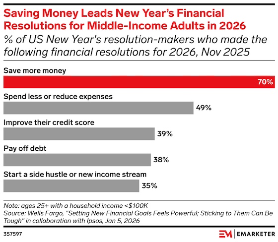 Key stat: Saving more money is the top financial resolution among US resolution makers ages 25+ with an annual household income under $100,000, according to Wells Fargo and Ipsos. | | | |