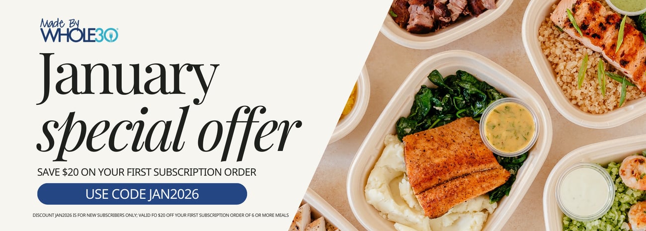Made By Whole30 can help you finish strong. These fresh prepared meals are 100% Whole30-compatible, made with locally-sourced, delicious ingredients, and ready in minutes. The best part? Now through February 5, get $20 off your first subscription order of six or more meals with code JAN2026. |