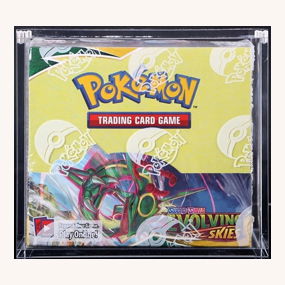 Pokemon Evolving Skies Booster Box Sword & Shield that is factory sealed in an acrylic case.