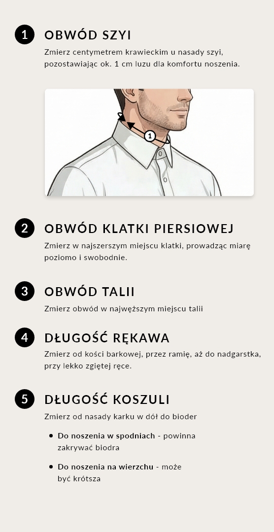 Skoro już wiesz, jak prawidłowo się zmierzyć, czas przejść do wyboru koszuli. Odpowiedni krój i rozmiar to gwarancja komfortu, swobody ruchu i nienagannego wyglądu - niezależnie od okazji.