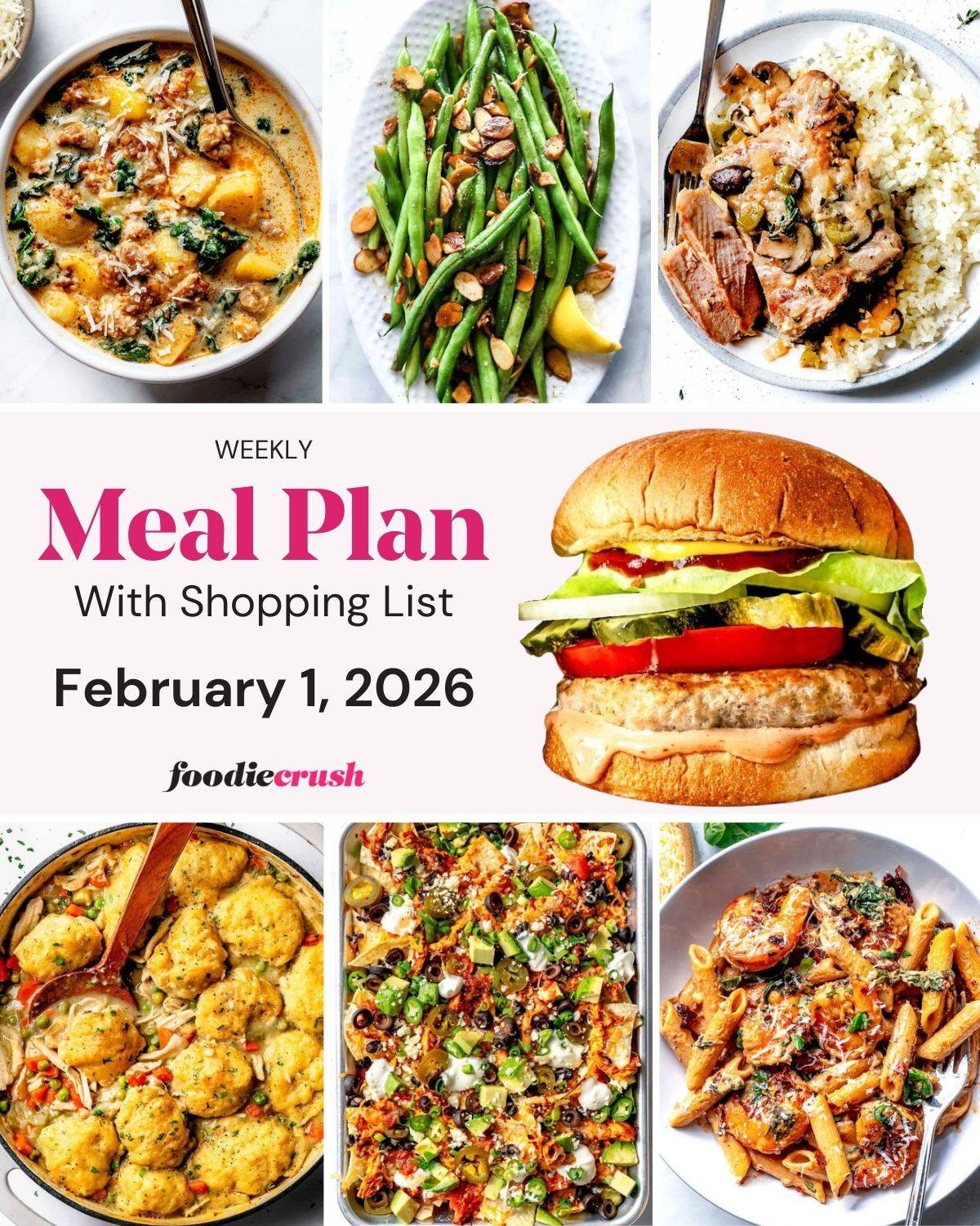 This week's meal plan includes: copycat Zuppa Toscana, super juicy turkey burgers with killer garlic fries, smothered pork chops and green beans, marry me shrimp pasta, easy chicken and dumplings, game day chicken nachos, and my favorite Italian salad that goes with just about everything.