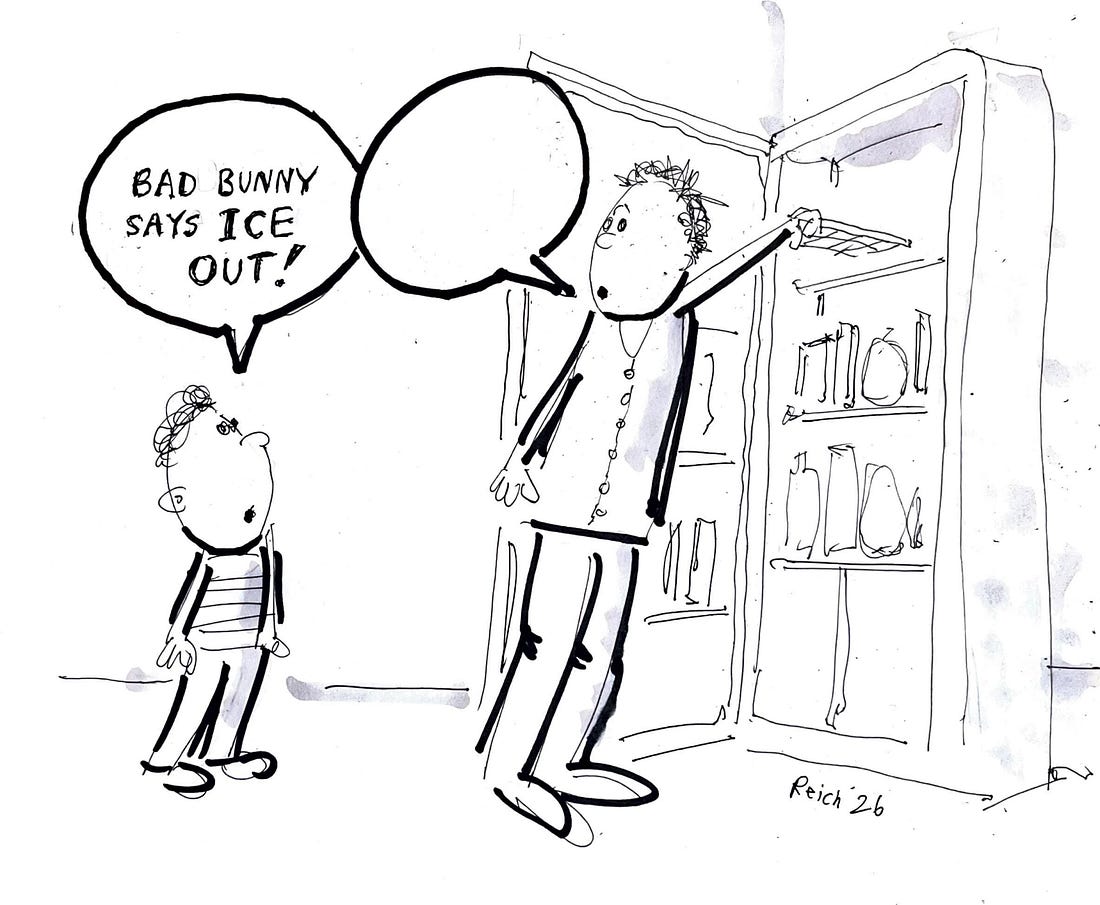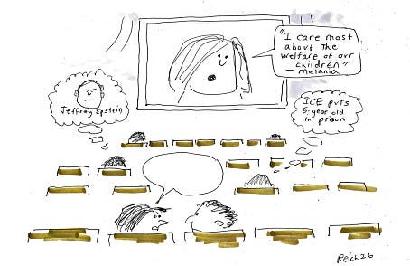 Friends, Please submit your caption in the Comments section and, as before, please use the Comments section only for captions. Winners will be announced next Sunday. For consideration, please post your caption by Monday at 9 pm PT, 12 midnight ET. Last week’s winner: “Let’s go. First time I ever had to line up to get out of a movie!” (Congratulations, The Mitz). Runners up: “I really don’t care for her, do you?” (Congratulations, Carol Nylen). “Is this a documentary or horror movie??” (Congratulations, Adam Laurie). “And Bezos should have spent that $75M on healthcare for amazon employees, or the salaries of the people he just fired.” (Congratulations, Melany). “Is this the dictator’s cut?” (Congratulations, Andy Klein). “Why are we paying to watch a movie about a hooker married to a gangster when we can just watch White House correspondents every day for free?” (Congratulations, margaret kelly). “I don’t really care, do you?” (Congratulations, William Rappaport). So glad you can be here today. Please consider becoming a paid subscriber of this community so we can do even more. |