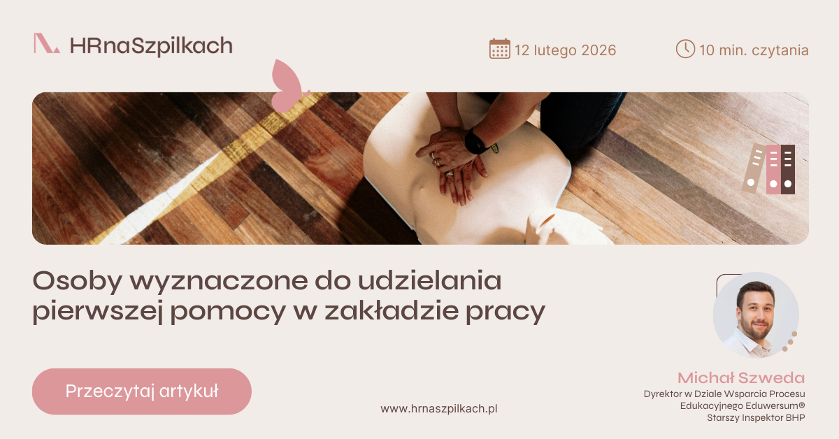 Dzień dobry Adam, Witam Cię w Weekendowej Czytelni HR i zapraszam do lektury merytorycznych opracowań z obszaru prawa pracy, wynagrodzeń i HR. Kadry i płace to nasza pasja, a Ciebie zapraszam do korzystania z jej efektów! Pierwsza pomoc w zakładzie pracy to nie dobra praktyka. To obowiązek ustawowy! Ten najważniejszy, bo decydujący o ludzkim życiu temat przybliża dziś Michał Szweda, Starszy Inspektor BHP. W wielu organizacjach procedura wyznaczania osób do udzielania pierwszej pomocy pojawia się dopiero przy kontroli albo po wypadku. Tymczasem obowiązek ten wynika z przepisów i dotyczy każdego pracodawcy - bez względu na branżę czy liczbę zatrudnionych. Co ważne, liczba przeszkolonych pracowników powinna być wystarczająca do tego, aby w pracy stale była obecna taka osoba. Osoba wyznaczona do tej funkcji musi być na każdej zmianie, a dane kontaktowe do niej, takie jak imię i nazwisko, miejsce wykonywania pracy, numer telefonu służbowego, powinny być łatwo dostępne. Czytaj więcej tutaj > |