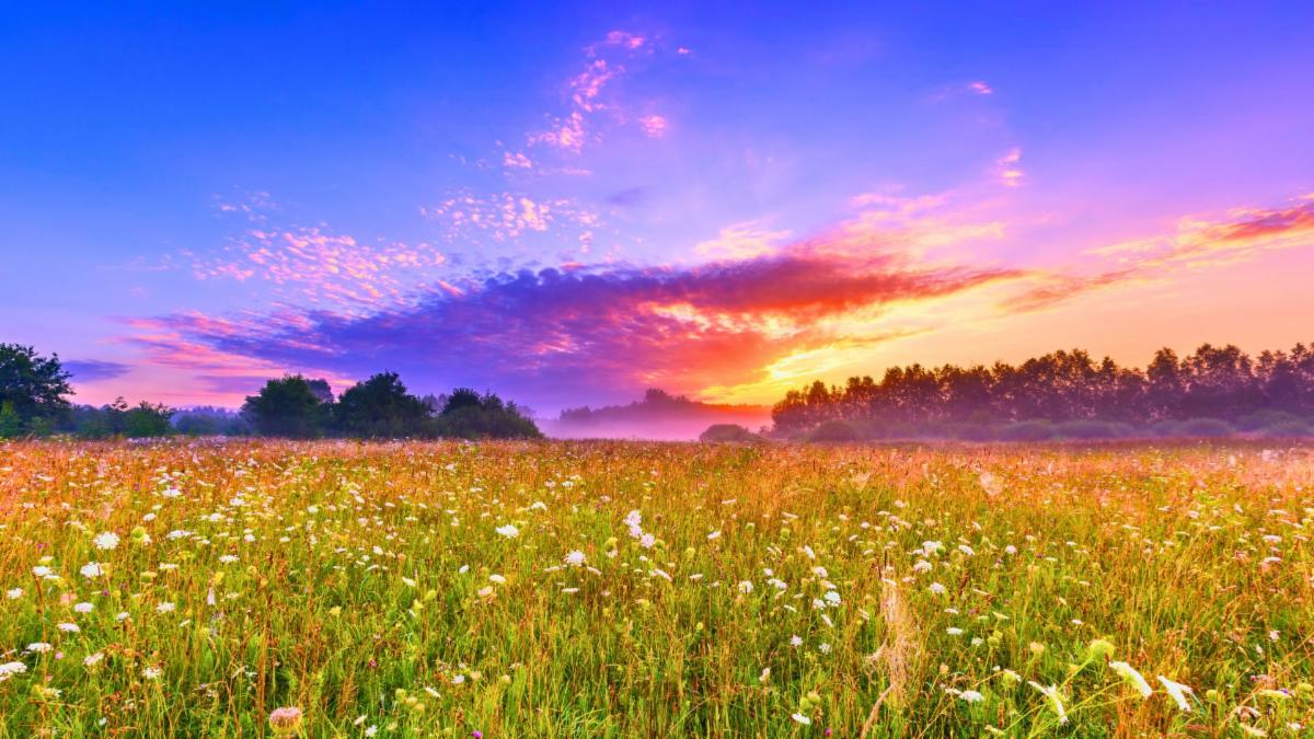A peaceful meadow stretches beneath a breathtaking sunset, where streaks of pink, orange, and violet melt into the sky, casting a warm, gentle glow over the landscape. Wildflowers sway softly in the golden grass, and simply standing there, surrounded by such quiet beauty, provides a deep sense of calm. |