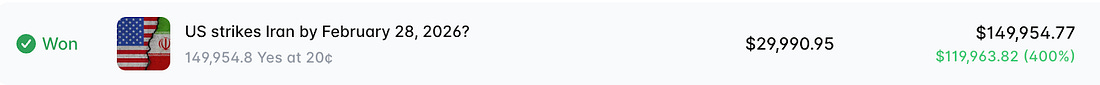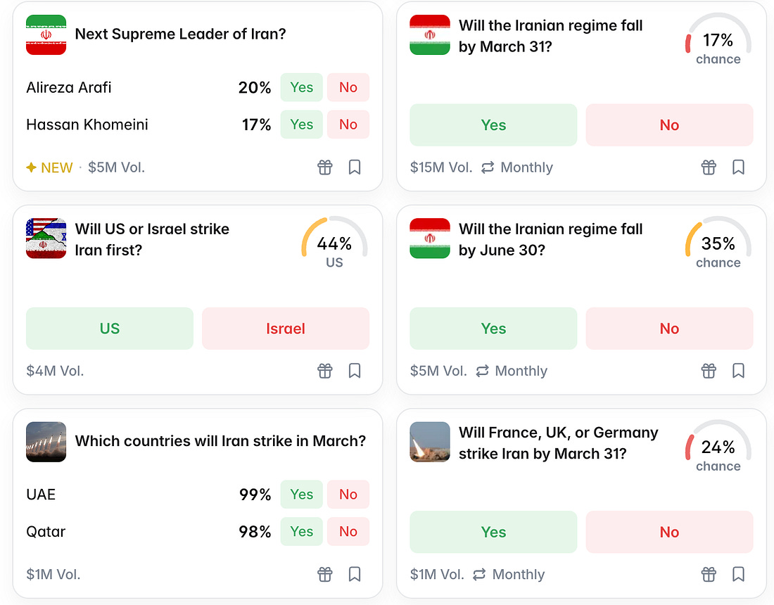 Right-wing billionaires are seizing control of American media. The Trump-supporting Ellison family struck a deal last week to acquire Warner Bros., which would be merged with Paramount. Once approved, the Ellisons will control CBS News, TikTok, CNN, Comedy Central, HBO, and other outlets. David Ellison, the CEO of Paramount, already put conservative pundit Bari Weiss in charge of CBS News. He reportedly promised Trump he would make “sweeping changes” at CNN if the Trump administration greenlighted his Warner Bros. acquisition. We cannot allow information to be controlled by a few powerful and ethically malleable people. The only way to fight back is to build up independent media that is free from the influence of billionaires and corporate America. Popular Information now has over 538,000 readers. It’s a start, but this moment demands that we accelerate our growth. And we can do it if subscribers like you upgrade to paid. On February 28, the United States and Israel began major combat operations in Iran. For some, the consequences of this action were fatal. By Monday, the war had claimed the lives of at least six U.S. soldiers, hundreds of people in Iran, and dozens more in neighboring Gulf states. The bombardment of Iran reportedly destroyed a girls’ primary school, killing about 150 people, the vast majority of them students. A spokesman for the U.S. military said CENTCOM takes the reports seriously and is “looking into“ the allegation. For others, the beginning of the war was simply a money-making opportunity. In the hours before the strike, six newly-created accounts on the prediction market Polymarket raked in nearly $1 million by betting that the U.S. would strike Iran by February 28. Many observers, including the analytics site that first flagged the suspicious trades, suspect that the accounts benefited from insider knowledge. But it’s impossible to say for sure. The international version of Polymarket, where the bets were made, does not require users to identify themselves and accepts bets in crypto. One such account, “dicedicedice,” made a single wager of nearly $30,000 that the U.S. would strike Iran by February 28. Hours later, the account recorded a profit of about $120,000. Overall, “$529 million was traded on contracts tied to the timing of the strikes” on Polymarket, Bloomberg reported. The White House “denied anyone in Trump’s orbit was behind the lucrative trades.” It’s unclear which members of the administration would be considered “in Trump’s orbit.” Donald Trump Jr. serves as an advisor to both Polymarket and its chief rival, Kalshi. Moving forward, Polymarket is offering dozens of markets on war-related developments. On its website, Polymarket describes allowing wagers on acts of war as a public service, claiming it provides vital information to “those directly affected by the attacks.”