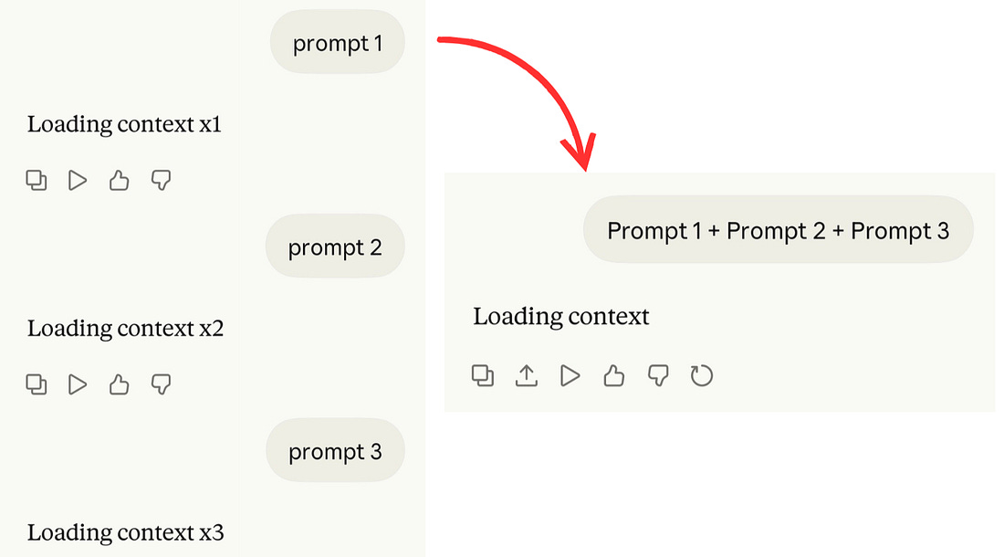 #1 Edit your prompt. Don’t send a follow-upWhen Claude’s answer misses the mark, most people send another message like “no, I meant...” or “can you try again but...” Every follow-up message adds to the conversation history. Claude re-reads the entire conversation every single turn. So by message 10, you’re not just paying for message 10 — you’re paying for messages 1 through 9 all over again. This adds up fast. Instead of sending a new message, click the edit icon on your original message, fix the prompt, and regenerate. The old exchange gets replaced instead of added. Here’s how to do it Go to the prompt you wrote → click the pencil icon → rewrite your prompt → hit send. Claude regenerates as if the bad response never happened. #2 Start fresh every 15–20 messagesAgain, Claude re-reads your entire conversation history every single turn. Your first message costs hundreds of tokens. By message 20, a simple question can cost thousands of tokens. The longer the chat, the more expensive every message becomes. Long chats are expensive chats. Start a new conversation every 15–20 messages. If you need context from the old chat, ask Claude for a summary, copy it, and paste it into the new chat as your first message. Here’s how to do it When a conversation starts getting long → ask Claude: “Summarize everything we’ve discussed so far” → copy the summary → open a new chat → paste it as your first message → start fresh You get fresh context without the bloated token cost. #3 Combine multiple questions into oneSending three separate messages means Claude loads the conversation context three separate times. Batch your questions into a single message. Instead of sending “Summarize this article,” then “List the main points as bullets,” then “Suggest a headline,” send all three at once. Write one message like: “Summarize this article, list the main points as bullets, then suggest a headline.” One message. Three answers. One context load. |