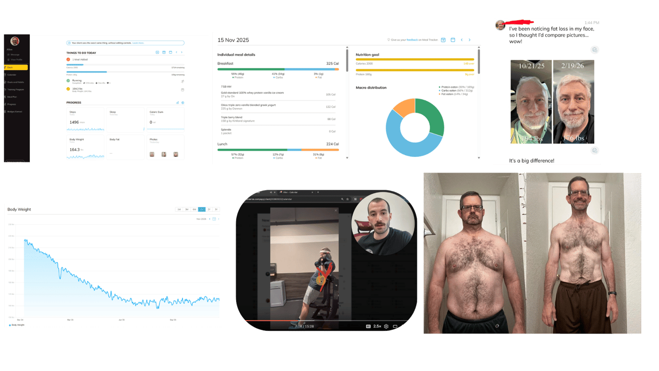 Video reviews - weekly reviews where your coach pulls up your file to review your adherence, give feedback, and adjust the plan as needed.
