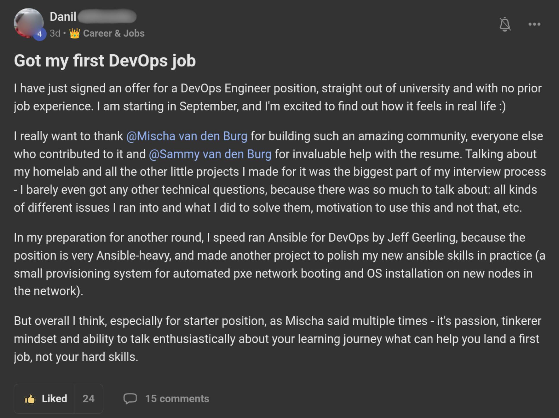 …this one is for you. From university to DevOps EngineerDanil signed his first DevOps Engineer contract straight out of university. He didn’t have any work experience. In his interviews, something interesting happened: They barely asked generic theory questions. Instead, they spent most of the time on: