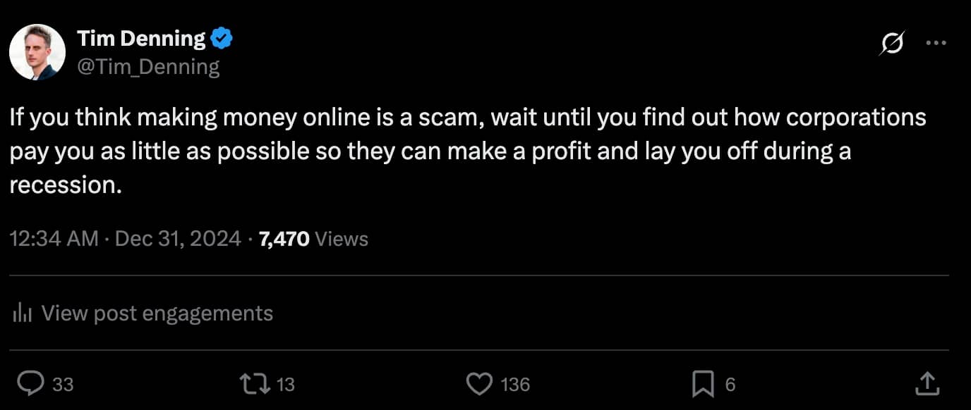 Tuesday, I showed a 16-month-old Twitter post to a workshop crowd that made them go absolutely bananas. Worth talking about here to set the scene. First, the post. Then, the lesson. Like I said. A big reaction from attendees. Maybe because we’re finally seeing the full truth of that prediction. Layoffs in waves. Companies bragging about record profits on Monday but then firing their people in a casual 10:30 email on Friday morning. Many of the people I know who still have jobs are shaking in their too-expensive loafers every day on the way to work just wondering when it’s going to happen When will I get that email? When will I be invited to a 1-1 meeting with the manager? When will someone replace me with AI? Nothing worse than feeling powerless. Watching your whole livelihood get taken away by some middle manager who never has to talk to you again after firing you. 1.17M Layoffs in 2025. Trend is continuing this year. The sad truth is: Many people know this threat, but do nothing anyways. They don’t go flight mode or fight mode. They just freeze. Panic. Lock up. Watch Netflix til their eyeballs water, hoping everything works out fine. They do this because the thought of learning new skills, finding a new job, or creating a business sounds too hard. “I don’t have time!” Trust me. It’s far easier to make the time while you’re busy. Better for you to be in control. Most people think they’ll have time if the layoff happens. In truth, panic sets in and they usually go through the same tired pattern. Desperation → Beg for Job → Settle → Repeat Now for a bit of good news. There is still a ton of exaggeration around the whole AI conversation. For example: I saw a tweet about how Gemini can now easily summarize inbox activity and connect it to other platforms. Which would be cool. Imagine a robot that could scrape through my entire email archive and tell me which single subject line or which single phrase was most likely to turn someone into a customer. The tech bois say that’s here now. In reality, Google Gemini says this: (Word for word) “Using the native filters in your Gmail is more accurate than my summary” In other words: The bois are cracked out. As usual. Still, though. It’s not all hype. Claude launched an update 3 days ago where you can now pull out your phone at a cafe and tell your computer at home to get to work on something. That’s real. That’s now. That’s just the beginning. It’s happening now. Jobs will continue to be eliminated. Existing businesses go downhill. Let this be a wake up call. You can’t ignore this stuff. All you can do is move fast enough to survive the wave. You can get help with that in Fearless Money Makers. Here’s what we help people do