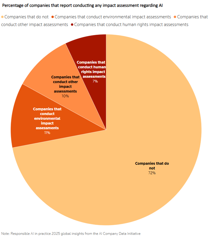 Click here to check out the latest report by the Thomson Reuters Foundation’s AI Company Data Initiative which looks at governance concerns in AI. Here is a chart on the percentage of companies that report conducting any impact assessment regarding AI, with a whopping 72% that do not conduct any AI impact assessments. |
