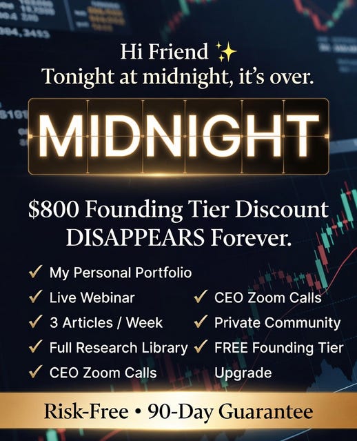 Remember: ALL my investable assets are in this Portfolio. This means our incentives are aligned. 📈 The 3 Biggest Opportunities I See Right NowYou’ll also learn about my 3 favorite stocks at this point in time. These aren’t just “good stocks.” These are the kinds of companies that can genuinely change your financial life. Opportunity #1 — The Compounding Machine of the CenturyThis business has delivered +18,000% returns since 2006. Let that sink in. $10,000 invested in 2006 would be worth over $1.8 million today. The company generates massive amounts of cash. What makes it even more remarkable is that the company is now trading at its cheapest valuation level ever. A 100x winner… on sale…. Is the market serious right now? Opportunity #2 — The Boring CompounderMost investors skip this one because it’s boring. That’s exactly why I love it. This company is transforming an entire industry in the United States. It has delivered a return +1,700% since 2016. $10,000 turned into $170,000 in less than 10 years. The track record speaks for itself: ✅ Consistent revenue growth, year after year When I compare the fundamentals versus the valuation right now, it just doesn’t make sense. The stock is way too cheap. The market is giving you a gift. And gifts like this don’t last long. Opportunity #3: A Cash-Printing MachineA profit margin of 70%. Let that number sink in. Most companies would kill for margins half that size. This company dominates its entire industry. It keeps printing cash. It keeps growing. It’s still the market leader. And yet... the stock has been declining. While the stock price goes down, the intrinsic value keeps going up. That’s one of the most powerful setups you can find in investing. The only thing I’m worried about for this stock? I’m afraid it gets acquired before the market wakes up. Here’s Everything You Get as a Partner✅ 📈 Full access to Our Personal Portfolio (where ALL my money is invested) That last one is important. The Founding Tier normally costs $1,200/year. You get a free upgrade. This means you pay $399/year instead of $1.200/year. That’s $800 in savings. Every year. For life. Not sure yet? You have 90 days to decide. If it’s not for you, you get every dollar back. No questions asked. Everything In Life Compounds. P.S. The Founding Tier upgrade is about to disappear. The $800 discount is gone. This is the last email. Don’t say I didn’t warn you. |