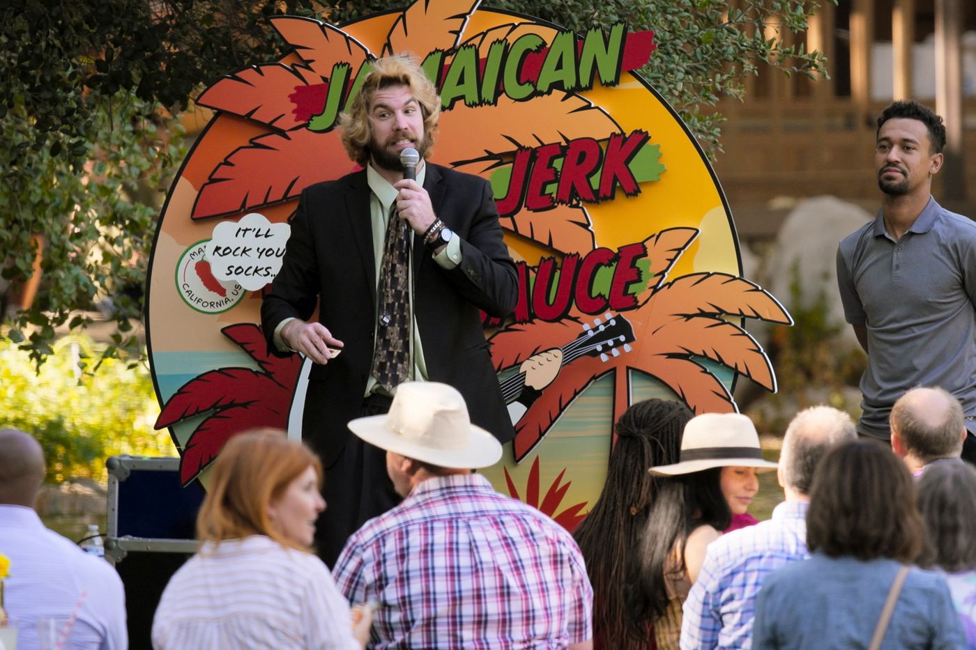 The Jury Duty team recruited Sia, a minor-league baseball team, and a real hot-sauce company to pull off the ruse of Company Retreat for hero Anthony Norman (right). Photo: Prime |