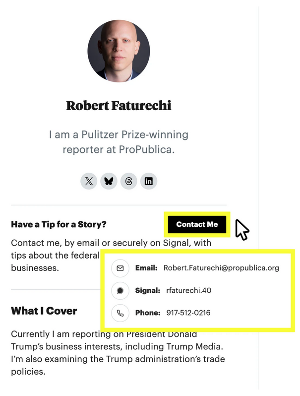 “This is Robert Faturechi from ProPublica,” Fake Me wrote. “I really need to get in touch with you.”