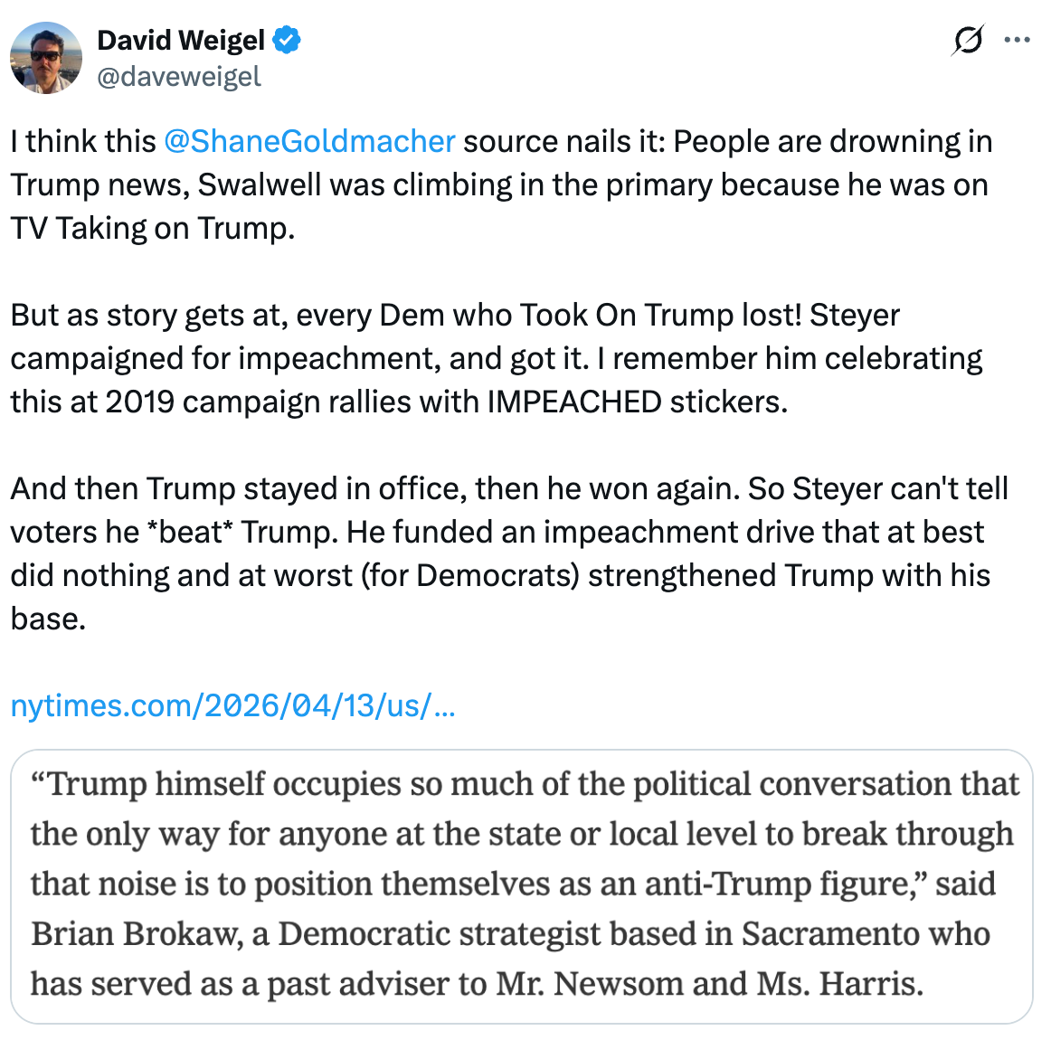 As I watched Kentucky Gov. Andy Beshear tell Rev. Al Sharpton how honored he was to attend Sharpton’s recent conference, my mind turned to a topic I’d kept it safely away from: the Democrats’ fight over Hasan Piker. Finished for now, impaled on Ezra Klein’s pen, the drama over a popular left-wing Twitch streamer started with a March 19 op-ed from leaders of Third Way, the centrist Democratic think tank. In their column, Jonathan Cowan and Lily Cohen told their party that “Hasan Piker and his fellow Jew-haters belong” on the other side of a bright line. Five days later, Michigan Democratic Senate hopeful Abdul El-Sayed announced a rally with Piker to support his campaign. Within 48 hours, both of El-Sayed’s primary opponents had condemned Piker; state Sen. Mallory McMorrow said the streamer “says things that are misogynistic and antisemitic, and said that the United States deserved 9/11.” The rally went ahead; El-Sayed told Politico that he thought people were over “cancel culture.” A version of this same mini-controversy played out more than 20 years ago — with Sharpton. He ran for Senate in 1992; Democrats initially refused to give him a forum, citing his links to a fringe far-left party and questioning “whether Al Sharpton is even a Democrat.” Sharpton talked his way into the race anyway, then a 1997 campaign for mayor, and then a 2004 presidential bid, which some Democrats also said the party shouldn’t have tolerated. “A true Democratic insurgent should compare Mr. Sharpton to [Pat] Robertson and [Jerry] Falwell,” wrote Peter Beinart, the editor of The New Republic. “Before the Democrats can truly challenge the GOP, they have to challenge themselves.” Piker isn’t running for office. But like the young Sharpton, he’s trying to steer the Democratic Party’s direction by encouraging people who agree with him to get involved with it. And no matter how much a party or candidate might like to try, voters can’t be controlled when it comes to what they watch and listen to. And many voters are putting up with opinions, language, and content that used to be campaign-killers. During Donald Trump’s 2016 campaign and first term, he could start a whole news cycle with a retweet of some far-right account. Democrats would pile on because they wanted to beat him and genuinely found the post to be offensive. Republicans would distance themselves. That rarely happens anymore. (One notable exception: Trump’s sharing of an image that portrayed him as a Jesus-like figure, which got some genuine Republican outrage.) Our polity simply couldn’t contain two contradictory ideas — that Trump would say whatever he wanted, and that offensive speech must be strictly policed. The backlash to censorious liberalism has been a tremendous success, and the decline of traditional media has helped. Republicans would still like some jokes to hurt candidates, though. The Third Way/Piker fight gave them a hook to ask if other Democrats would reject Piker. When the host said that Sen. Jon Ossoff was one of his top picks for a 2028 presidential nominee, the NRSC demanded that the Georgia Democrat “immediately condemn Piker.” Ossoff ignored that, and I see no evidence that the people of Savannah or Marietta care that their senator, who has never appeared on Piker’s show, has a fan in a left-wing commentator who’s rooting for Hamas. Ordinary people are simply not policing this stuff. Did Third Way’s challenge to Democrats over Piker backfire? Cowan told me, in a statement, that the goal was warning Democrats that if they embraced Piker, they’d be tagged with his radicalism, and that the gambit worked. “Had Third Way not focused a spotlight on Piker, exposing the depth and breadth of his bigotry, mainstream Democrats might well have campaigned with him, just like El-Sayed,” he said. “Now they’ll stay away.” Michigan primary voters, however, aren’t exactly staying away from El-Sayed, who’s running as a progressive insurgent ready to grab attention and win arguments. His campaign told me that it saw a “29% increase in volunteer sign ups, and a 221% increase in dollars raised via our website and social media” once people started talking about the Piker stop. |