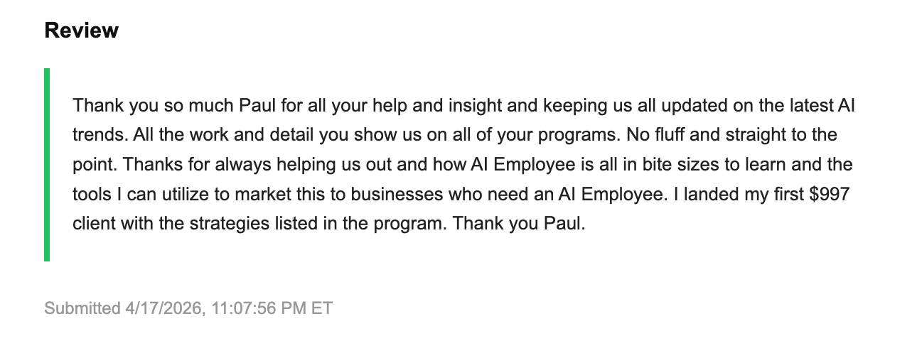 I got a message last week that made me smile. Someone grabbed AI Employee Formula, followed the system, and landed their first client. $997 upfront payment. First try. Here's what he said: "I landed my first $997 client with the strategies listed in the program. No fluff and straight to the point. AI Employee is all in bite sizes to learn and the tools I can utilize to market this to businesses who need an AI Employee." This is exactly what AI Employee Formula is designed to do. Show you how to sell AI employees to local businesses. Businesses pay you $1,000+ upfront to set it up. Then they pay you $500/month to keep it running. No cold calling. No hard selling. No chasing clients. You just position yourself as the person who can save them thousands on employee costs while actually making their business run smoother. And the crazy part? You can do this in your spare time. A few hours per week. Land 3-5 clients. You're making $1,500-2,500/month recurring. Every. Single. Month. For the next 12 hours only, I'm running AI Employee Formula at $19. At midnight tonight, it goes back to full price. |
