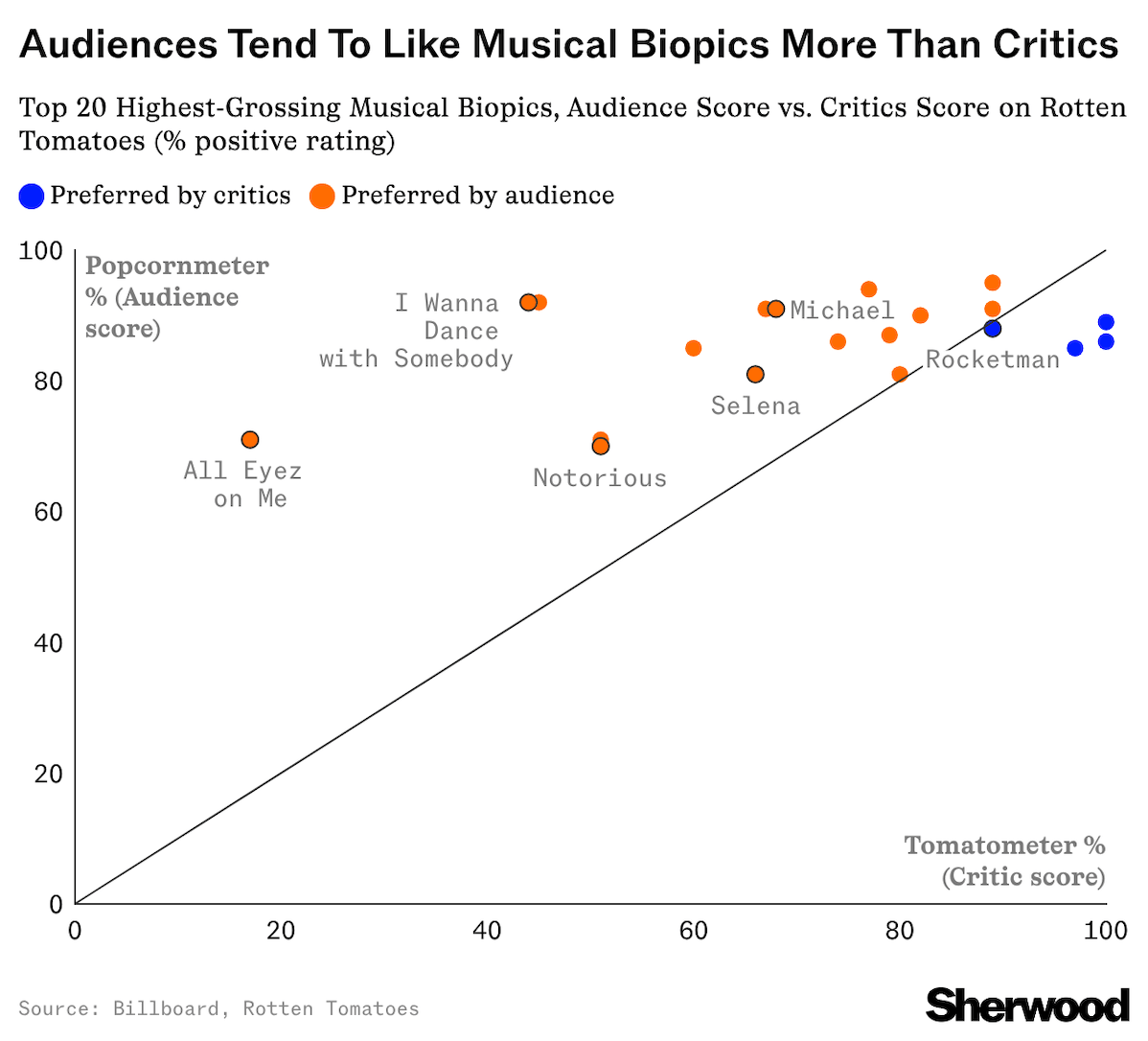 Looking at Rotten Tomatoes scores for the top 20 highest-grossing musical biopics, per Billboard, the Popcornmeter (audience score) is consistently positive. However, only eight of these films would qualify as “Certified Fresh” in terms of scores from critic reviews (above 75% positive ratings on the Tomatometer).