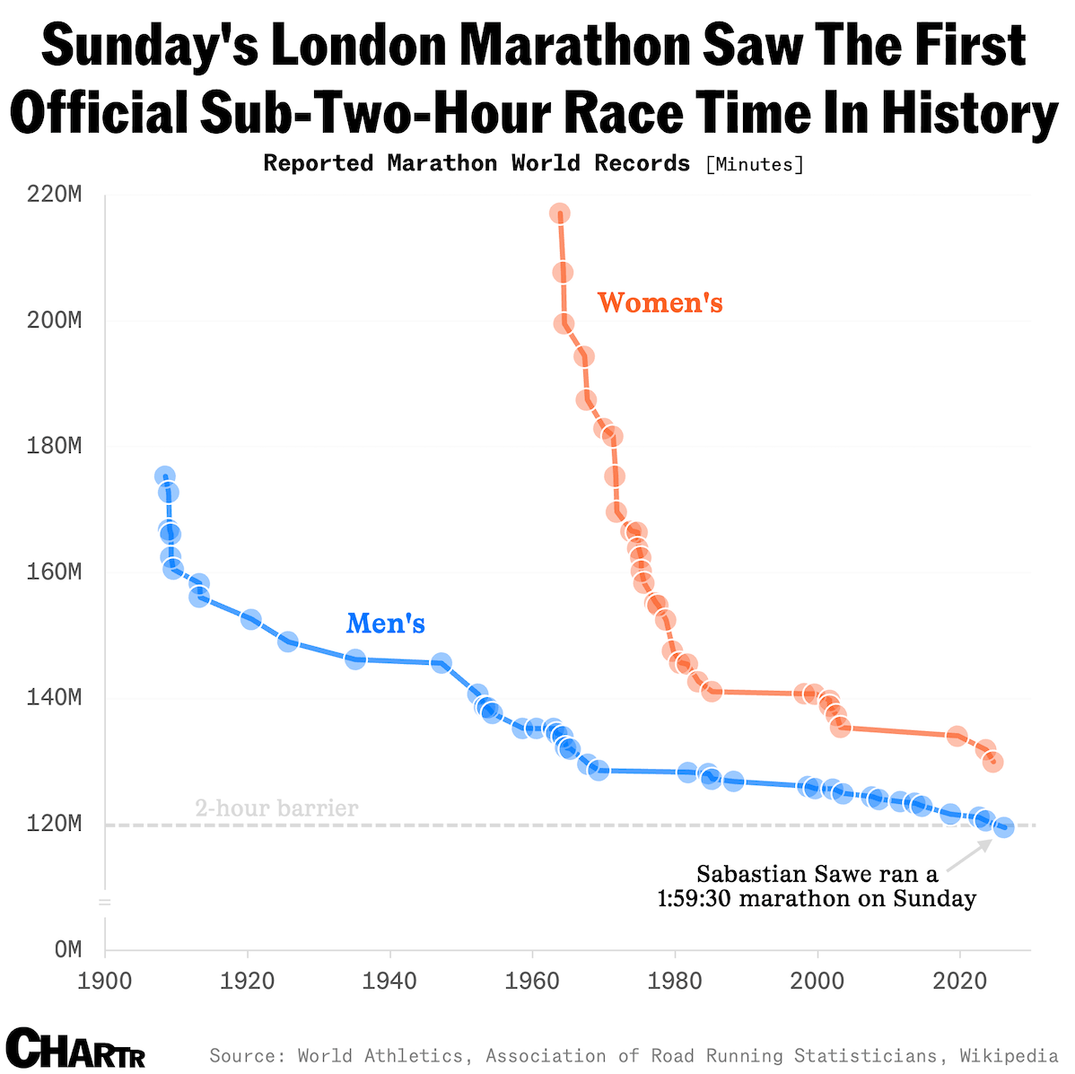 According to running shoe review site RunRepeat, men who can complete a 5K in 17 minutes and 30 seconds are in the top 1% of runners. Yesterday at the London Marathon, Sabastian Sawe, a 31-year-old runner from Kenya, shaved 3 minutes and 20 seconds off that pace, and then repeated that almost 7.5 more times, to become the first marathon runner in history to break the two-hour barrier in an official race, clocking in at 1:59:30.