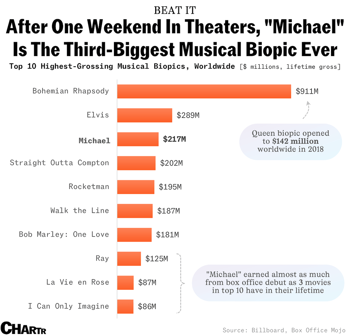 Combining a list of the musical biopics with the highest worldwide grosses compiled by Billboard with Box Office Mojo data, “Michael” is still some way off the ~$911 million lifetime gross seen for 2018’s Queen biopic “Bohemian Rhapsody,” but it's off to a smooth start.