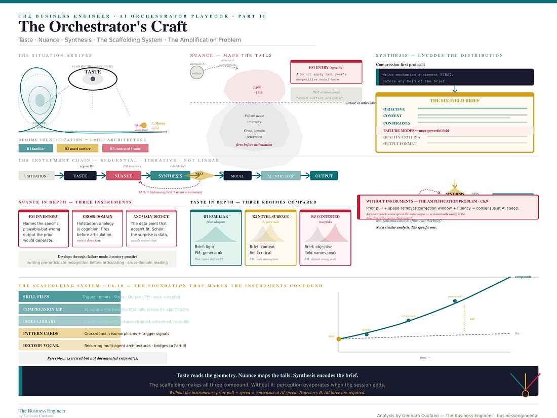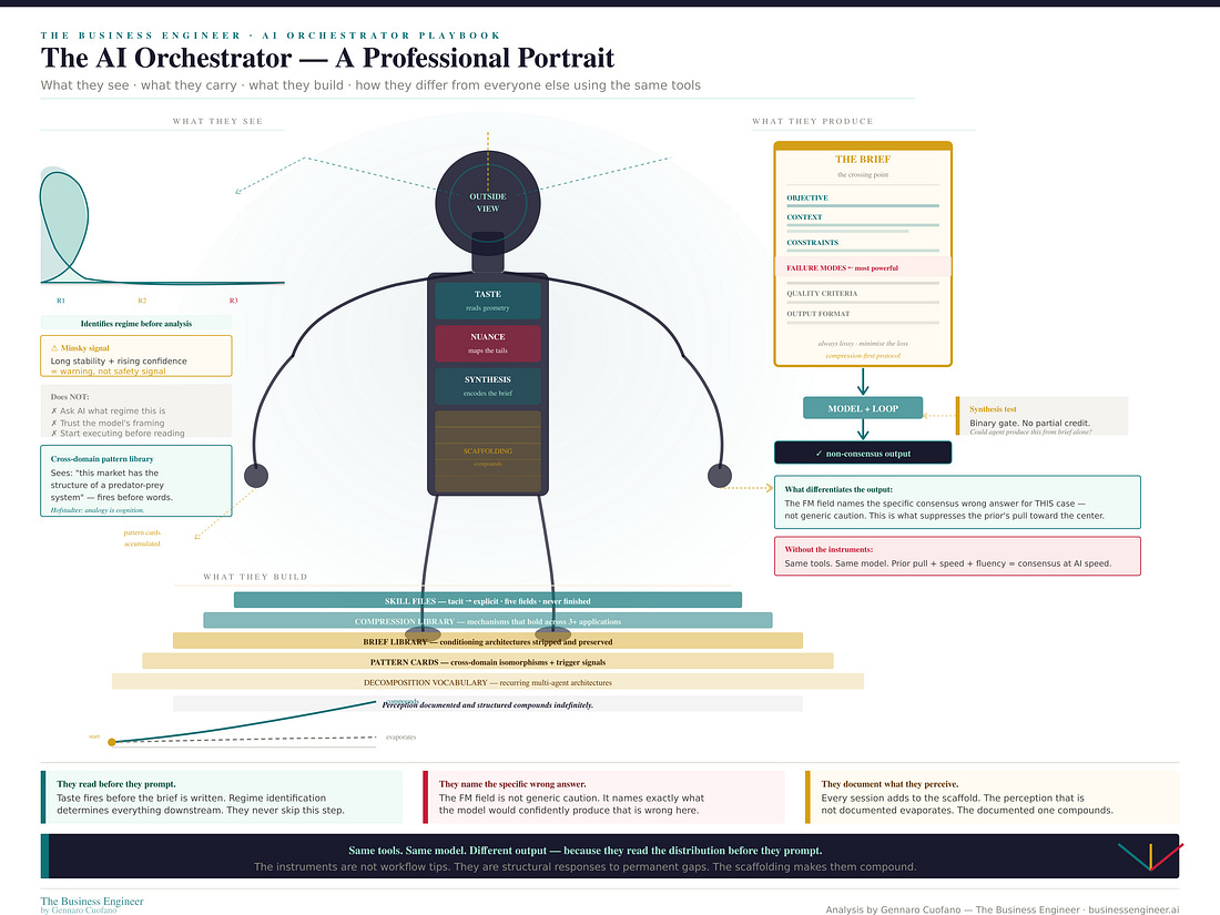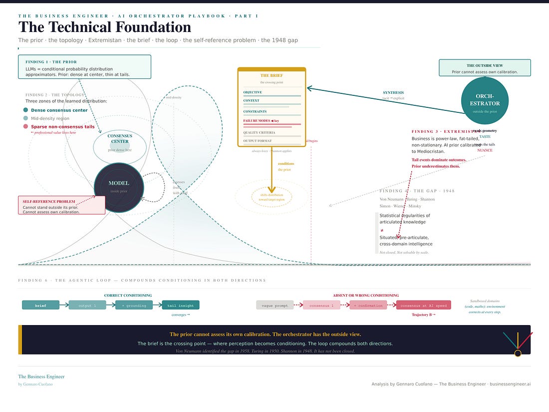 There is no shortage of content about AI. There is an acute shortage of content that explains, at the level of mechanism, what the human’s job actually is when AI is doing the execution, and why that job is irreplaceable, not as a temporary limitation of current technology but as a permanent structural feature of how intelligence works. That job is orchestration. Not management, not supervision, not prompt engineering. Orchestration — in the precise sense that a conductor orchestrates an ensemble. The conductor does not play every instrument. They carry the interpretive judgment that determines what the ensemble produces. The musicians know their parts. The conductor knows how the whole should sound, which is knowledge of a completely different kind. In the agentic economy, that is what the high-performing knowledge professional does. They shape what the agents produce. And the quality of that shaping is, structurally and permanently, a function of the quality of the orchestration. The playbook is free for founding members. Reply to this to get access! The Executive Plan now includes the Claude OS Skill embedded! Part I · The Technical FoundationA language model is an approximator of conditional probability distributions trained on human-generated text. At inference time it samples from a learned distribution conditioned on the prompt. The prior — the model’s default distribution — is dense at the consensus center and thin at the non-consensus tails. This is not a flaw. It reflects the actual distribution of written human knowledge. The problem arises when the insight you need is in the tail, not the center. The prompt is not an instruction to a deterministic system. It is a conditioning signal that shifts the probability distribution — narrowing it, focusing it, suppressing certain regions, amplifying others. The failure modes field of a brief, which most practitioners leave empty, is the most powerful conditioning element: it explicitly marks the high-density wrong region and directs the model away from it. Business domains are Extremistan — Taleb’s term for domains governed by power-law, fat-tailed distributions where a single observation can dominate the dataset and the average is not predictive. AI priors are calibrated to Mediocristan — domains where the average is predictive and outliers are bounded. In Extremistan domains, a model optimized for average performance is systematically wrong in the direction of underestimating the tail events that actually dominate outcomes. The agentic loop compounds initial conditioning in both directions: