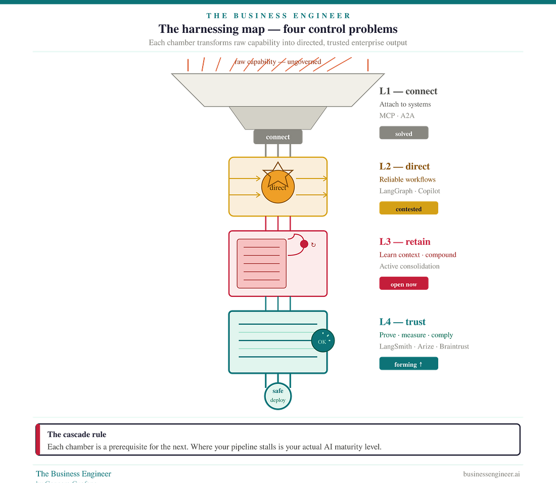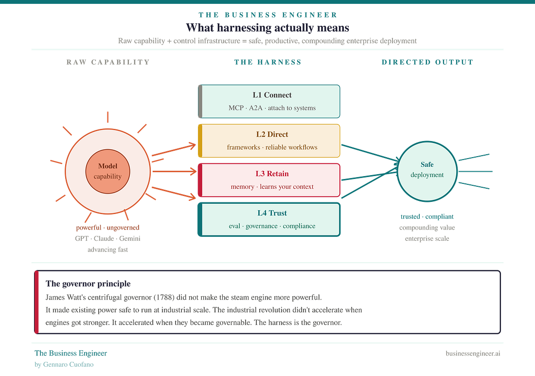 Part One: The Architecture — What Harnessing Actually MeansHarnessing is not a technical metaphor. It is a strategic one. A harness is not what makes an animal powerful. The animal is powerful without it. A harness is what makes that power directable — what converts raw capability into useful work, in a controlled direction, without the power running away and causing damage. The harness is the control interface between raw capability and productive output. In the AI context, the harness is the infrastructure — protocols, frameworks, memory systems, evaluation and governance tools — that sits between raw model capability and safe, productive enterprise deployment. Without it, capability exists but cannot be reliably directed, retained, or trusted. With it, even a less capable model can produce more enterprise value than a more capable model deployed without control infrastructure. The steam engine analogy makes this concrete. James Watt’s centrifugal governor, invented in 1788, did not make the steam engine more powerful. It made the steam engine deployable. Early steam engines were genuinely dangerous — they ran at uncontrolled speeds, pressure built without warning, and boiler explosions killed workers. The Industrial Revolution did not accelerate when engines got more horsepower. It accelerated when the governor made existing power safe to run at an industrial scale. The governor was the harnessing layer. Without it, the engine was a liability. With it, it became the foundation of a new economy. AI in 2026 is at the same inflection point. The engines are extraordinarily capable. GPT-5, Claude Sonnet 4.6, Gemini — remarkable instruments that would have seemed impossible five years ago. But without the control infrastructure that makes them governable, they are industrial-era steam engines without governors: impressive, occasionally explosive, not safely deployable at enterprise scale with consequential outputs. The Harnessing Map — Four Control Problems in SequenceThe harnessing map decomposes the AI control problem into four sequential layers. They are sequential because each one is a structural prerequisite for the next. Enterpr |